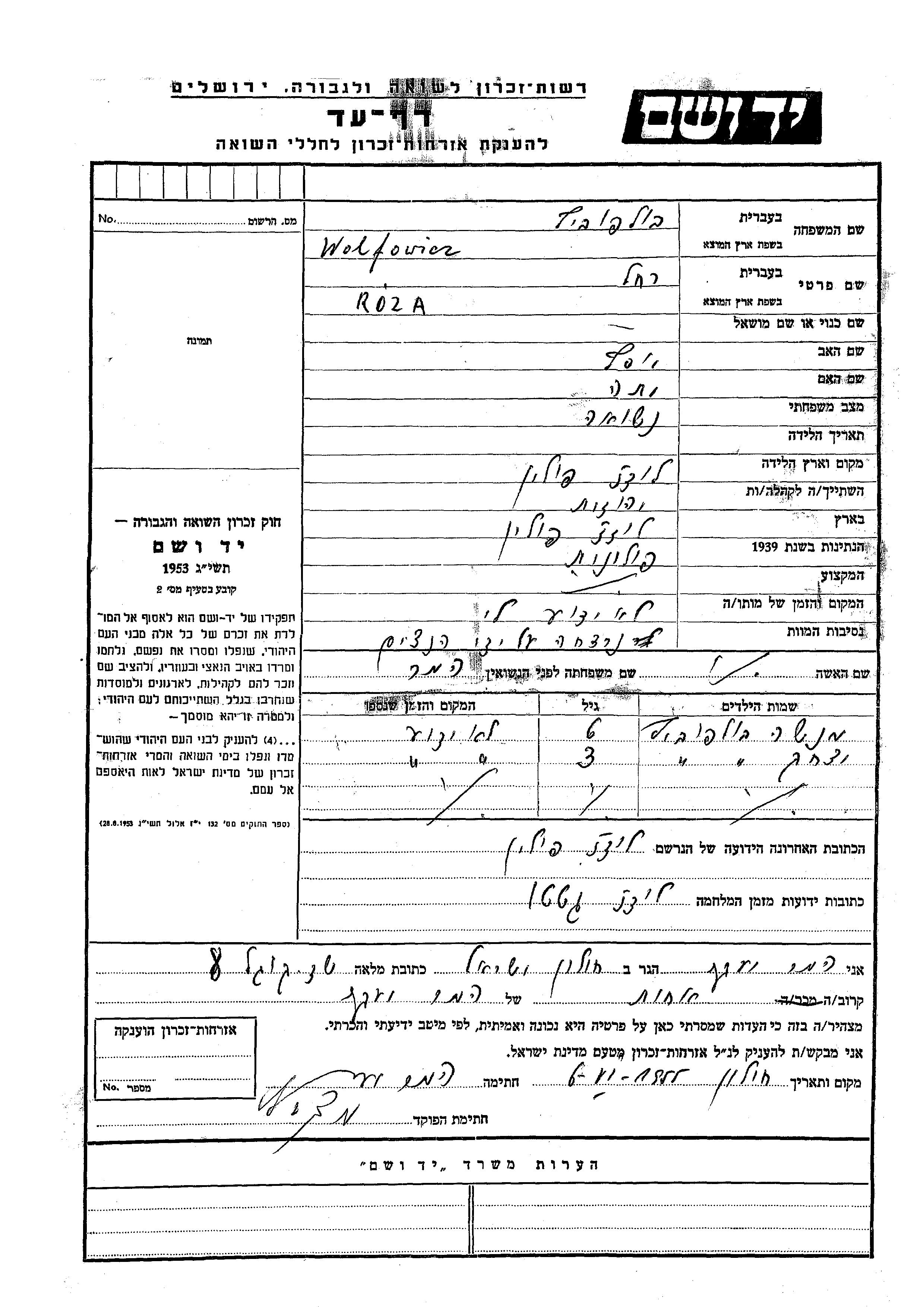 Yitzkhak Wolfowicz wurde Er war der Sohn von Roza Rakhel, geb. Hamer. Er war Kind. Vor dem Zweiten Weltkrieg lebte er in Lodz, Polen. Während des Krieges war er in Lodz, Polen.