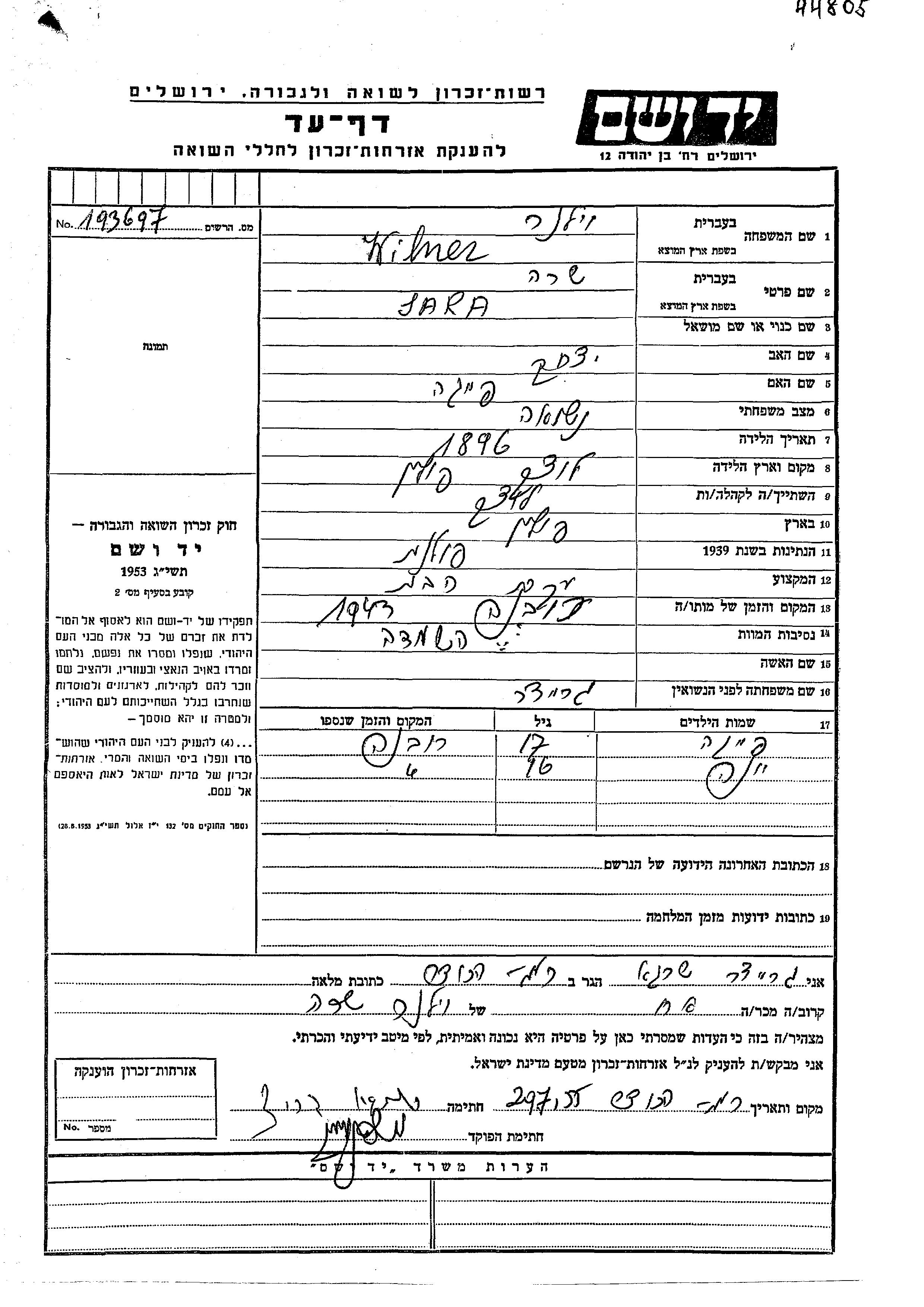 Yona Wilner wurde Er war der Sohn von Sara, geb. Greitzer. Er war Kind.
