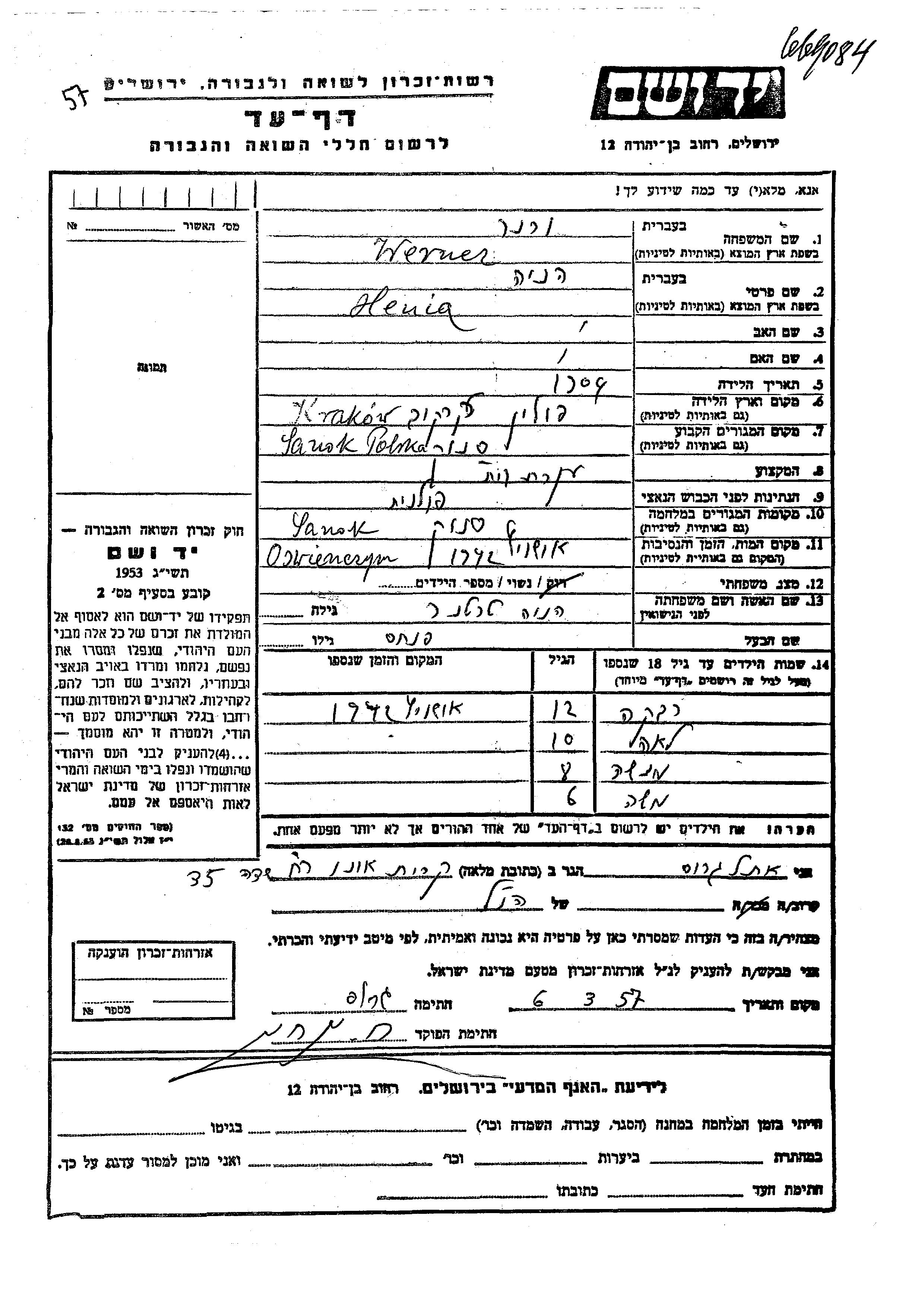 Lea Werner wurde Sie war die Tochter von Pinkhas und Henia, geb. Tratner. Sie war Kind. Vor dem Zweiten Weltkrieg lebte sie in Sanok, Polen. Während des Krieges war sie in Sanok, Polen.