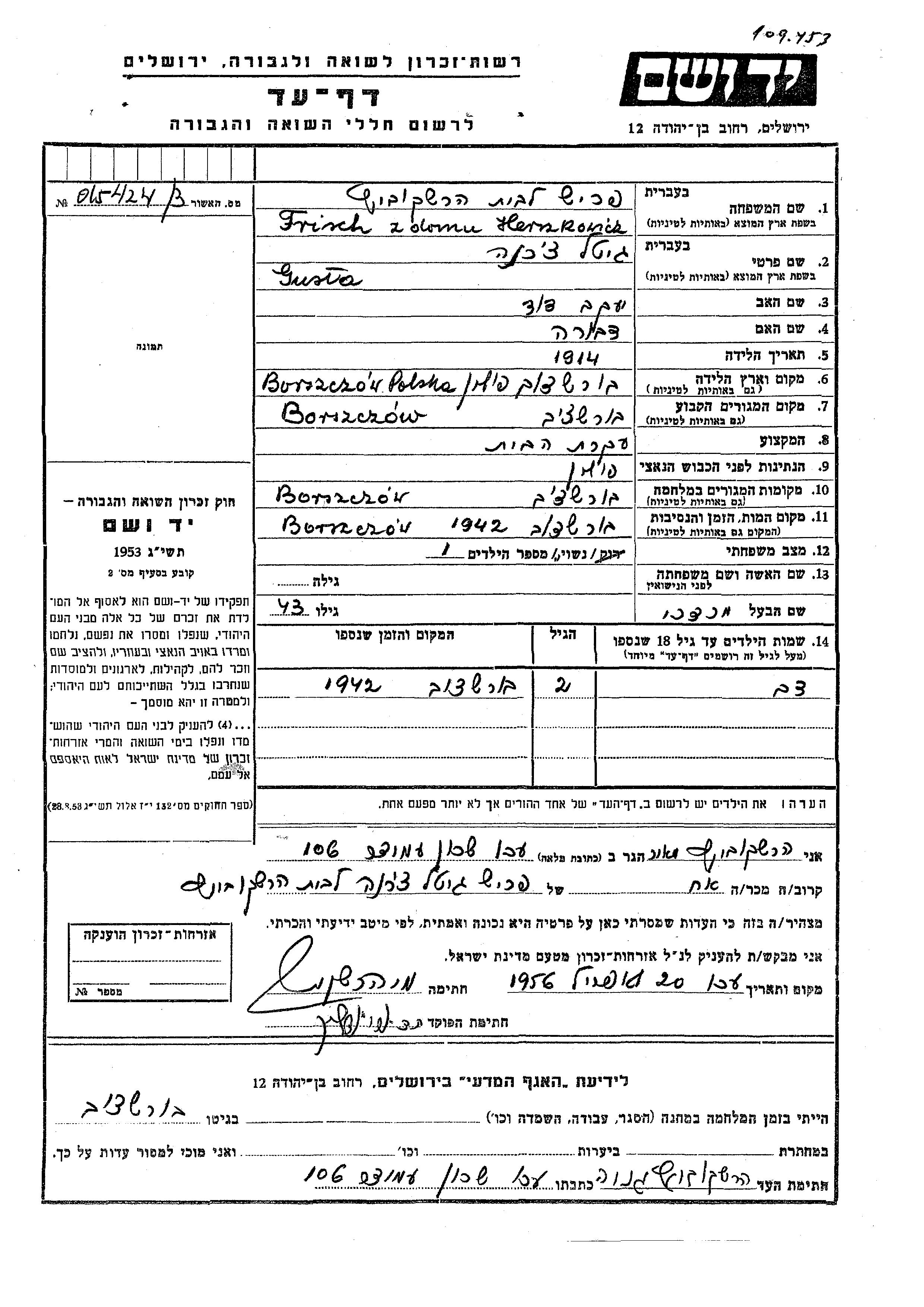 Dov Frisch wurde Er war der Sohn von Mordekhai und Gitel, geb. Hershkovitz. Er war Kind. Vor dem Zweiten Weltkrieg lebte er in Borszczow, Polen. Während des Krieges war er in Borszczow, Polen.