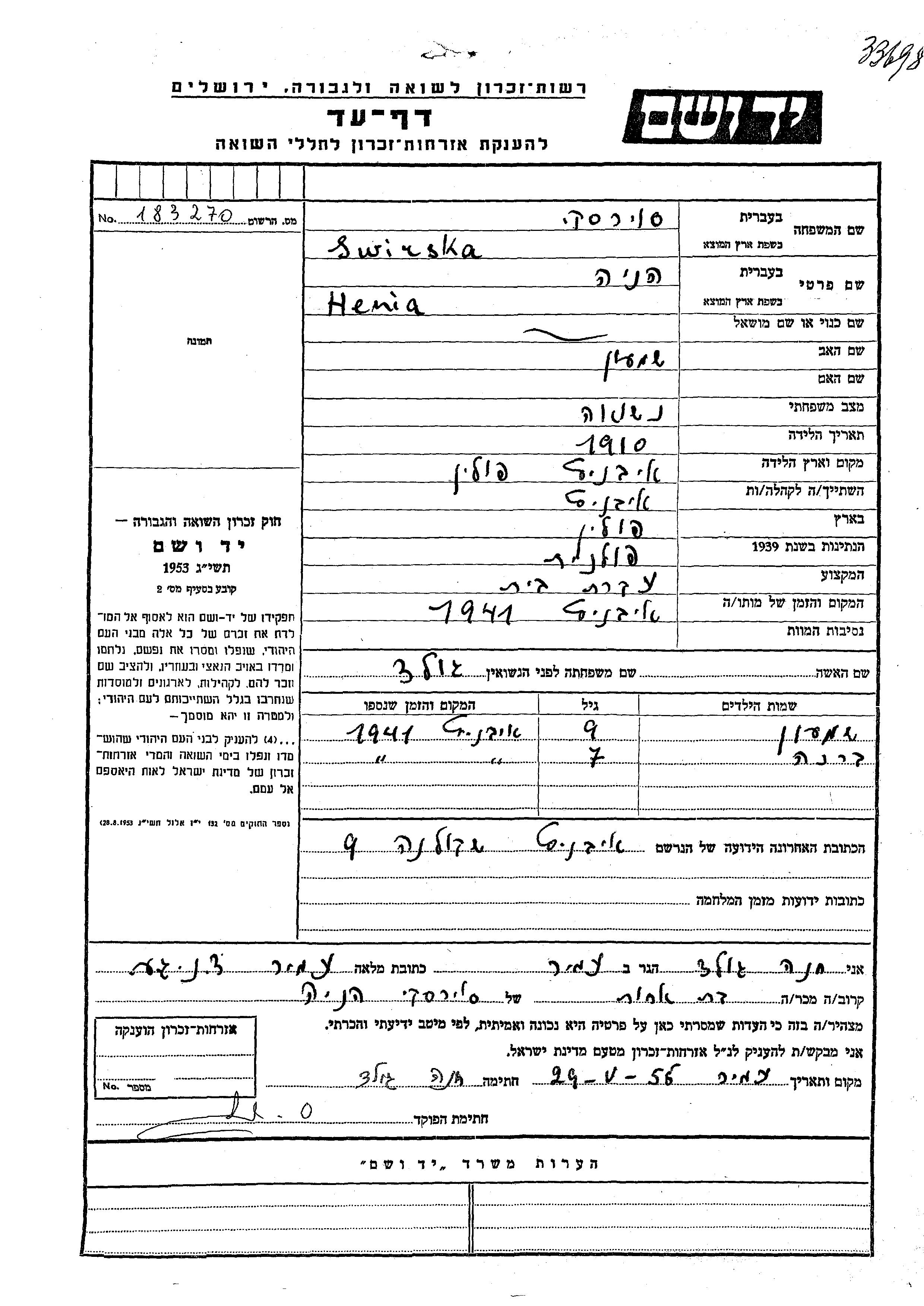 Brakha Swirska wurde Sie war die Tochter von Henia, geb. Gold. Sie war Kind. Vor dem Zweiten Weltkrieg lebte sie in Iwieniec, Polen. Während des Krieges war sie in Iwieniec, Polen.