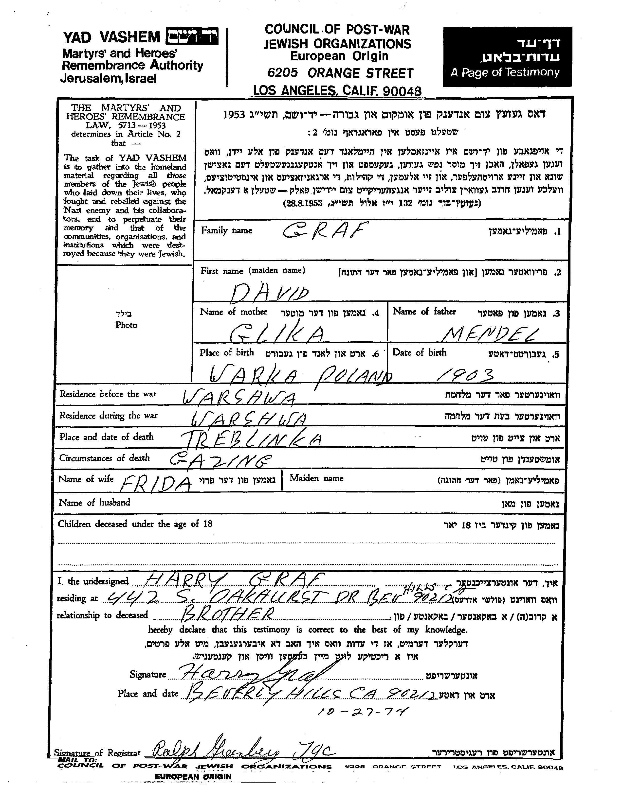 David Graf wurde im Jahr 1903 in Warka, Polen geboren. Er war der Sohn von Mendel und Glika. Er war mit Frida Verheiratet. Vor dem Zweiten Weltkrieg lebte er in Warszawa, Polen. Während des Krieges war er in Warszawa, Polen.