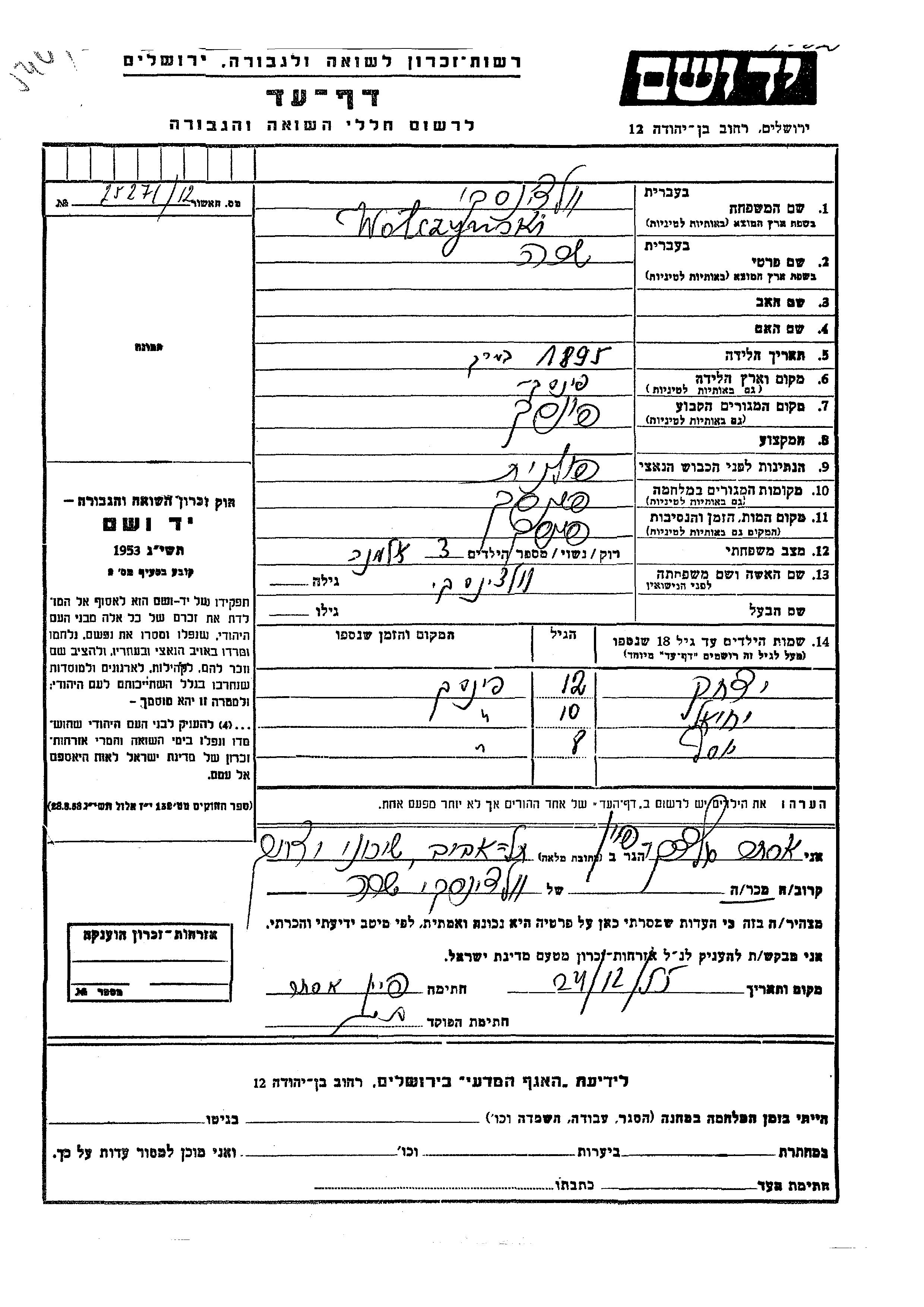 Yosef Wolczynski wurde Er war der Sohn von Sara. Er war Kind. Vor dem Zweiten Weltkrieg lebte er in Pinsk, Polen. Während des Krieges war er in Pinsk, Polen.
