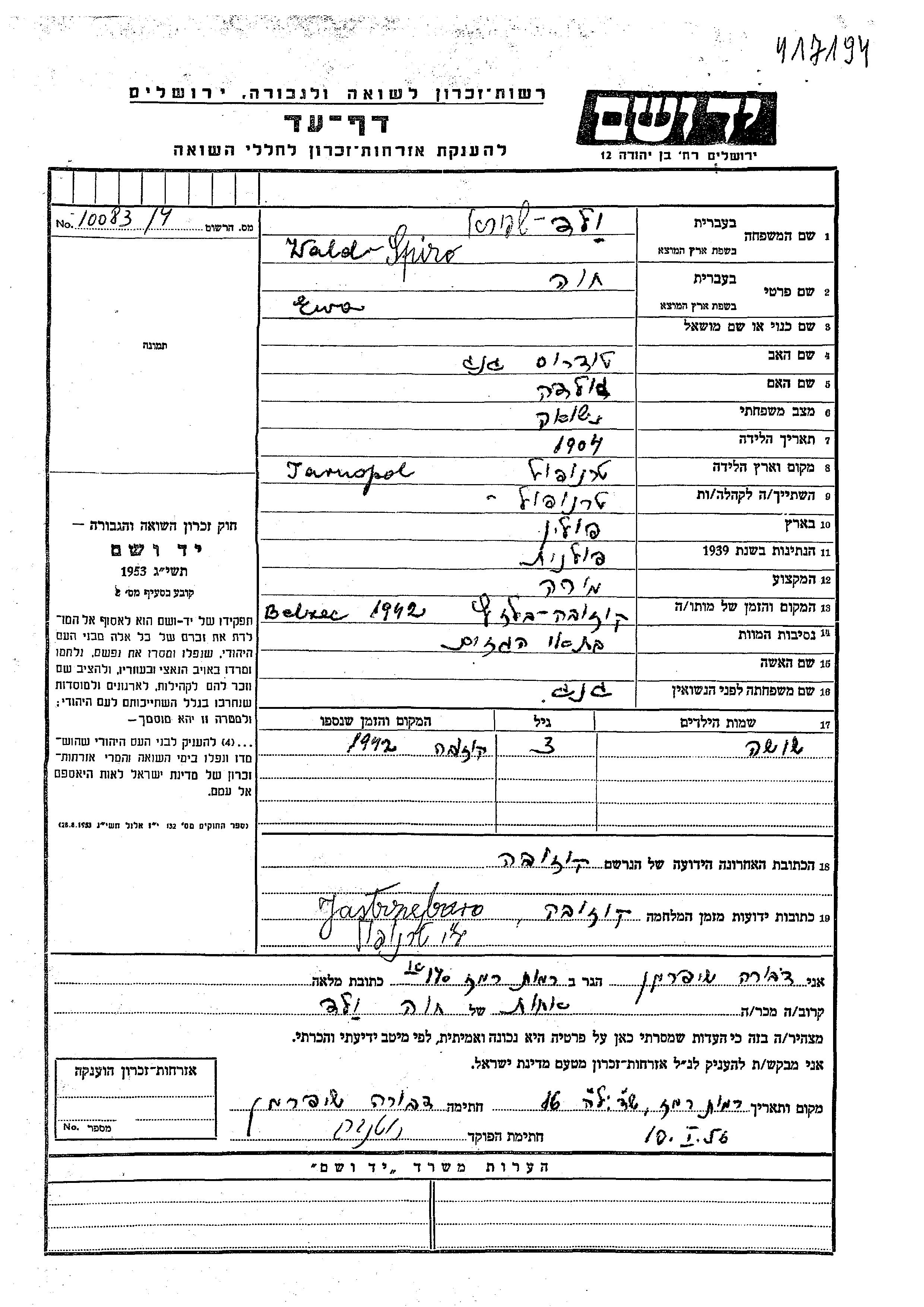 Shosha Wald Spira wurde im Jahr 1939 geboren. Sie war die Tochter von Chaia, geb. Gang. Sie war Kind. Vor dem Zweiten Weltkrieg lebte sie in Tarnopol, Polen. Während des Krieges war sie in Kozowa, Polen.