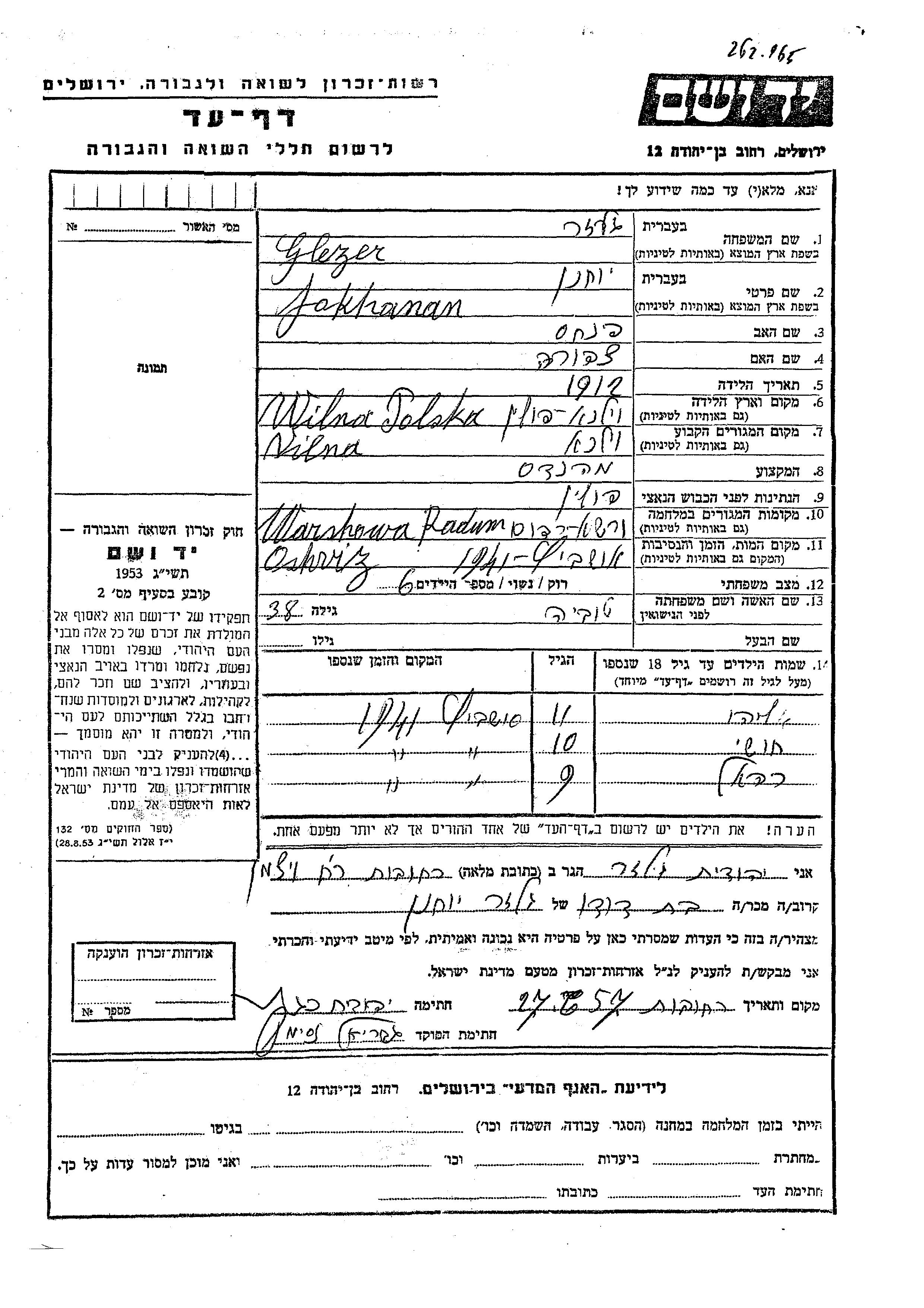 Chushi Glezer wurde Er/sie war der/ die Sohn/Tochter von Yokhanan und Tuvia. Er/Sie war Kind. Vor dem Zweiten Weltkrieg er/sie in Vilna, Polen. Während des Krieges war er/sie in Warsaw, Polen.