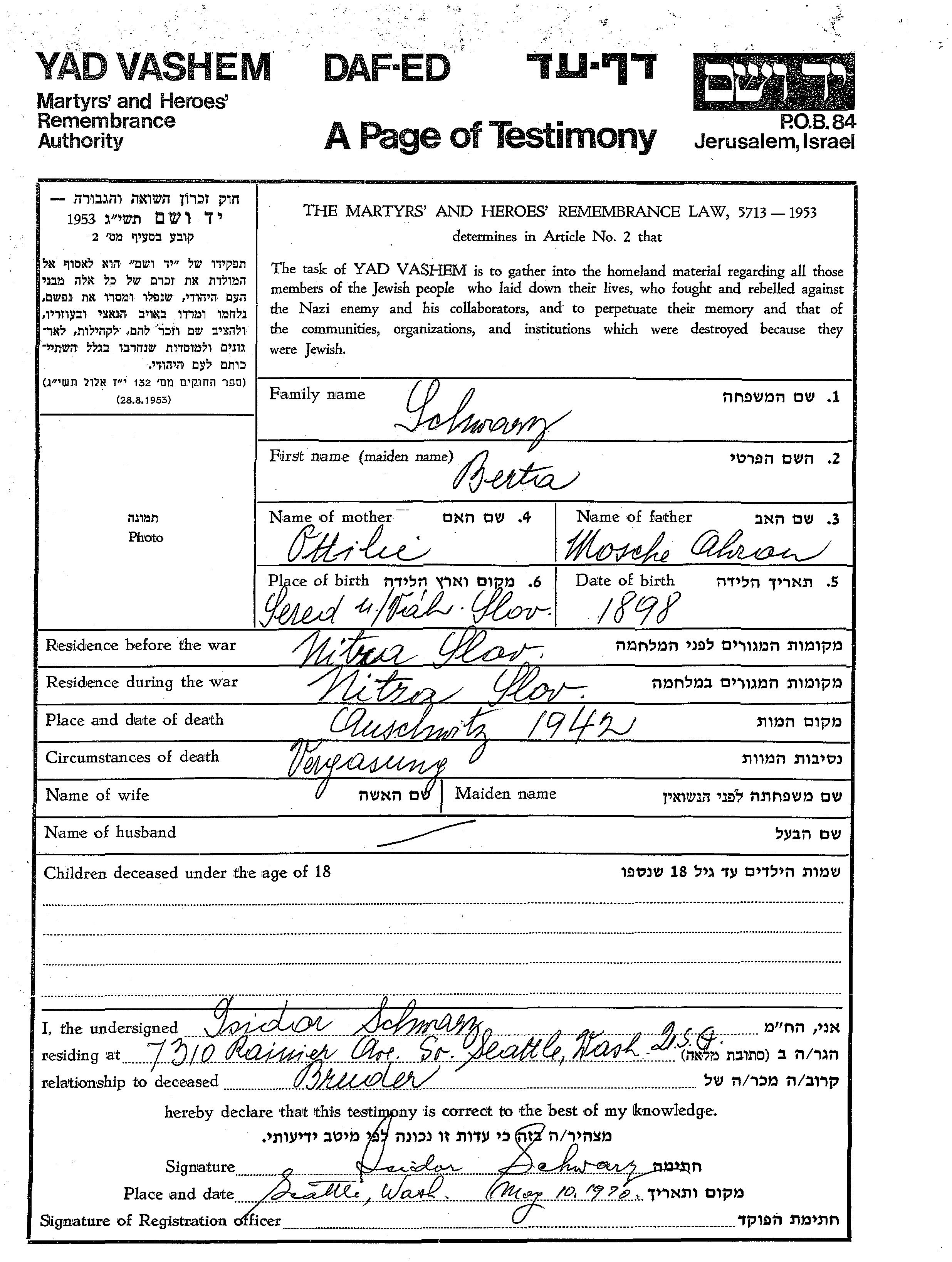 Berta Schwarz wurde im Jahr 1898 in Sered, Tschechoslowakei geboren. Sie war die Tochter von Mosche Abram und Ottilie. Vor dem Zweiten Weltkrieg lebte sie in Nitra, Tschechoslowakei. Während des Krieges war sie in Nitra, Tschechoslowakei.