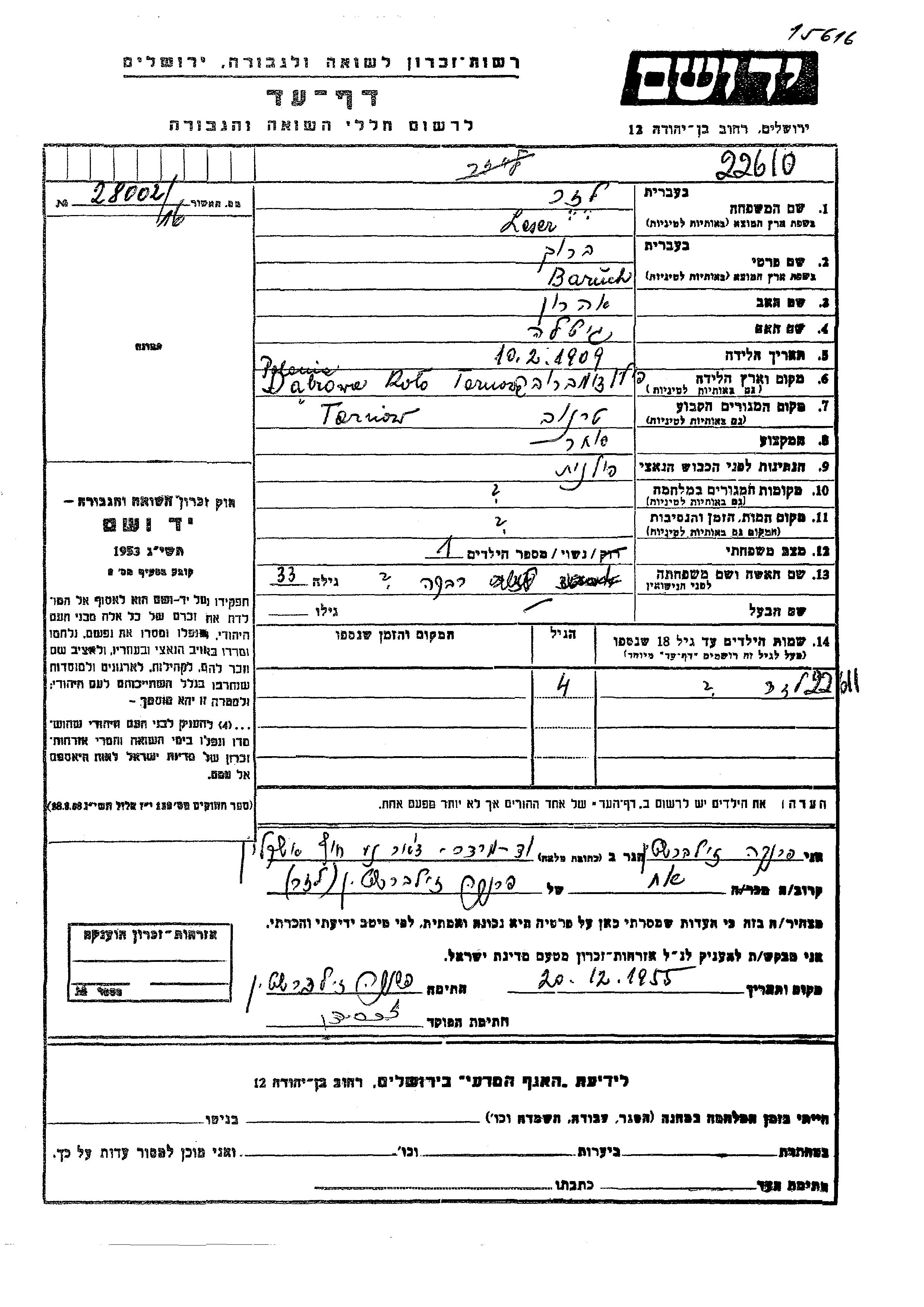 Lazar Leser Lazar wurde Er war der Sohn von Baruch und Rivka. Er war Kind. Vor dem Zweiten Weltkrieg lebte er in Tarnow, Polen.
