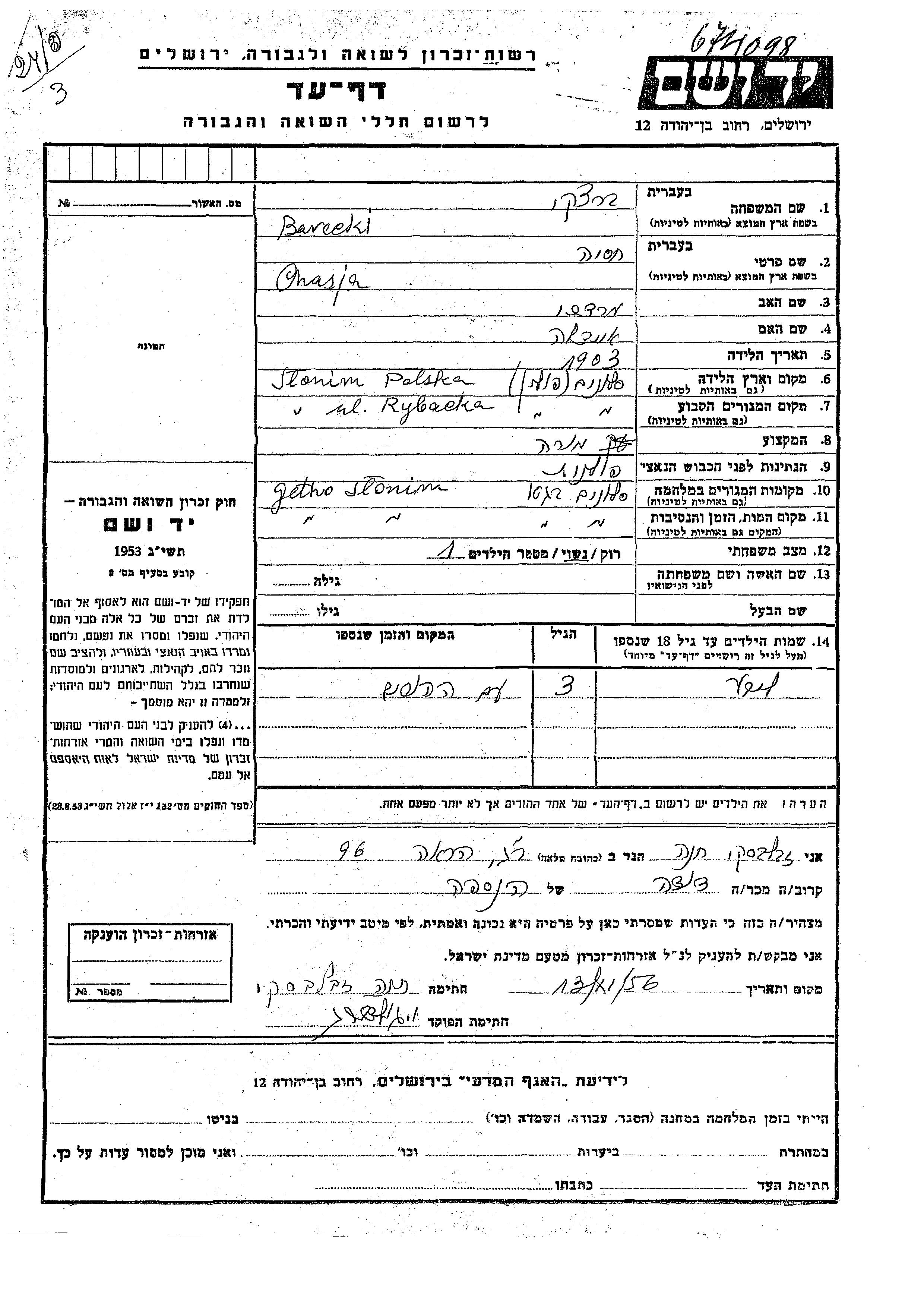 Libe Barecki wurde Sie war die Tochter von Chasia. Sie war Kind. Vor dem Zweiten Weltkrieg lebte sie in Slonim, Polen. Während des Krieges war sie in Slonim, Polen.