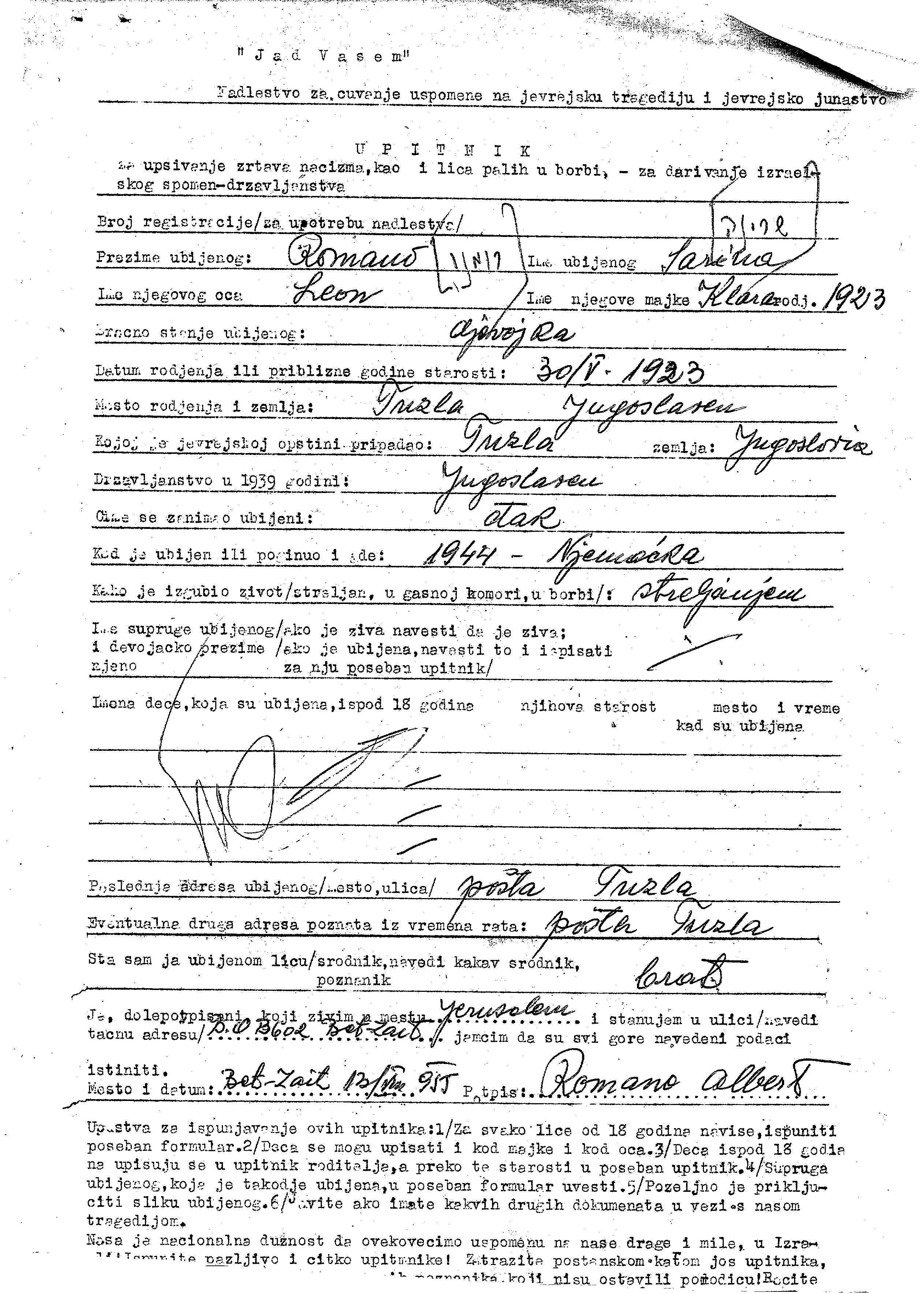 Sarina Romano wurde im Jahr 1923 in Tuzla, Jugoslawien geboren. Sie war die Tochter von Leon und Klara. Sie war Schüler/-in und Ledig. Vor dem Zweiten Weltkrieg lebte sie in Tuzla, Jugoslawien. Während des Krieges war sie in Tuzla, Jugoslawien.