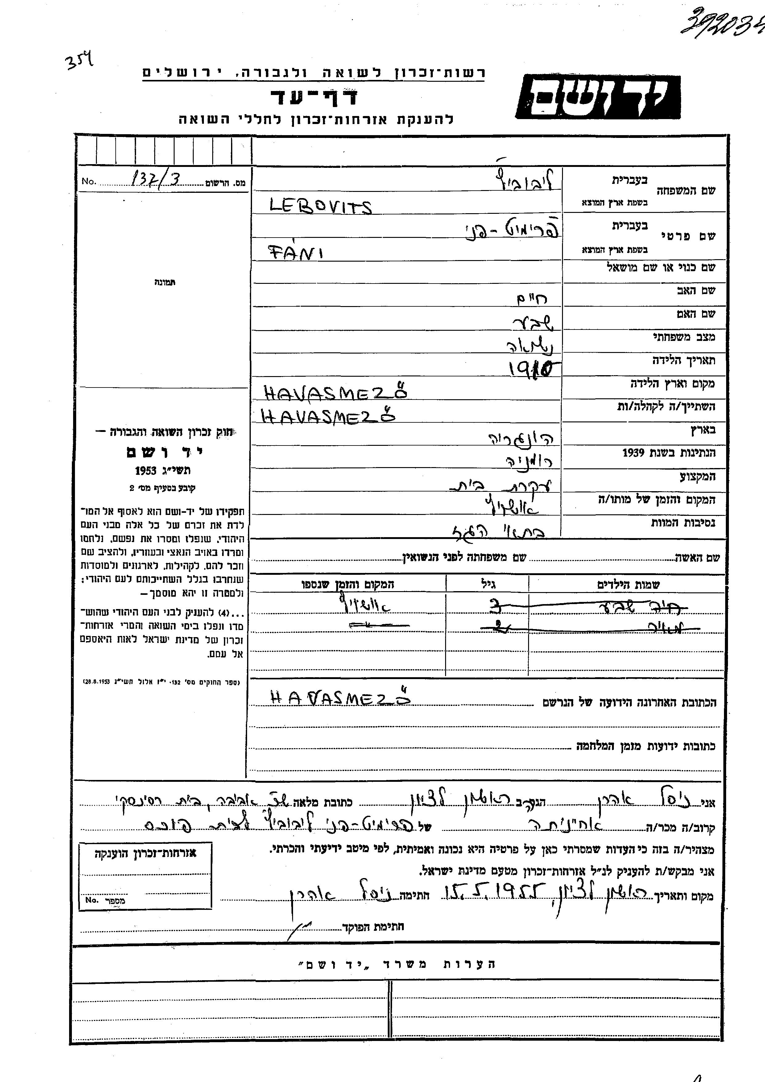 Meir Lebovits wurde Er war der Sohn von Fani Frimit, geb. Fuks. Er war Kind. Vor dem Zweiten Weltkrieg lebte er in Havasmezo, Rumänien.