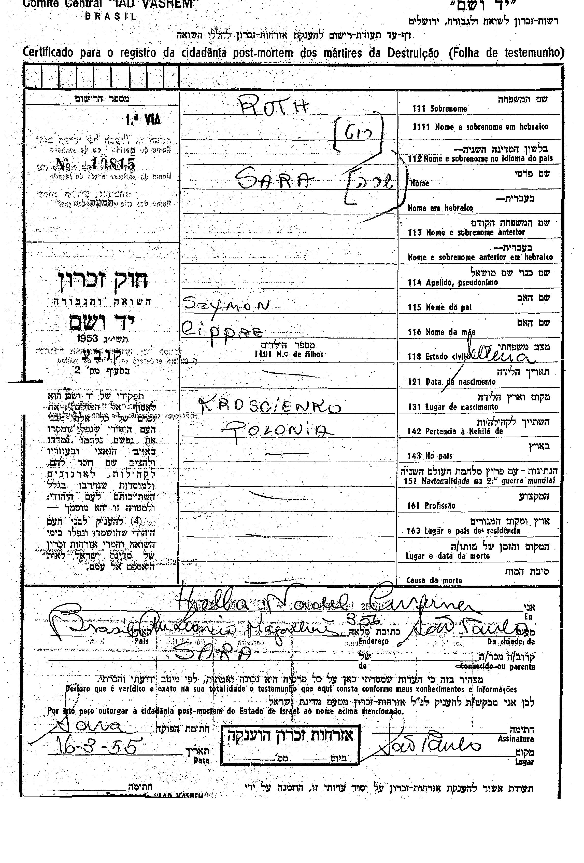 Sara Roth Rut wurde in Kroscienko, Polen geboren. Sie war die Tochter von Szymon und Cippre. Sie war Ledig. Vor dem Zweiten Weltkrieg lebte sie in Polen.