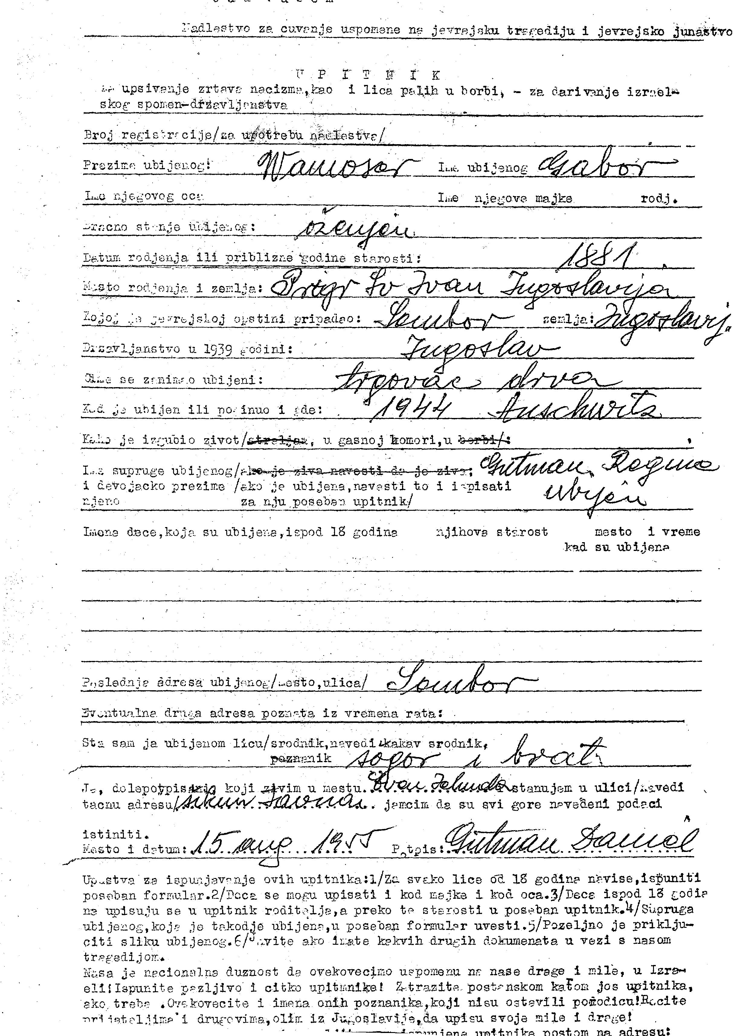 Gabor Wamoser wurde im Jahr 1881 in Prigrevica Sveti Ivan, Jugoslawien geboren. Er war Trgovac drvima und mit Regine, geb. Gutman Verheiratet. Vor dem Zweiten Weltkrieg lebte er in Sombor, Jugoslawien.