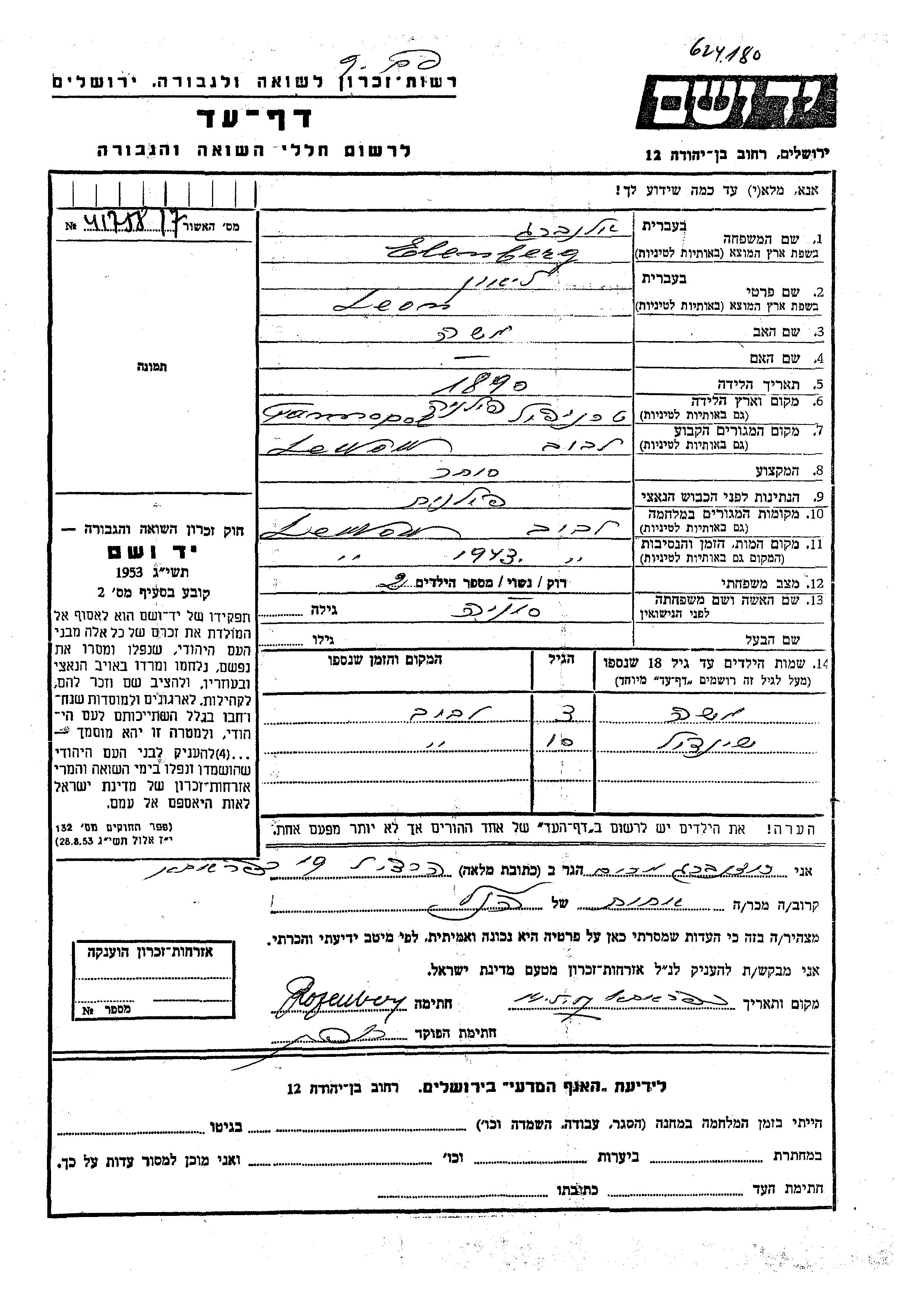 Moshe Elenberg wurde Er war der Sohn von Lion und Sonia. Er war Kind. Vor dem Zweiten Weltkrieg lebte er in Lwow, Polen. Während des Krieges war er in Lwow, Polen.
