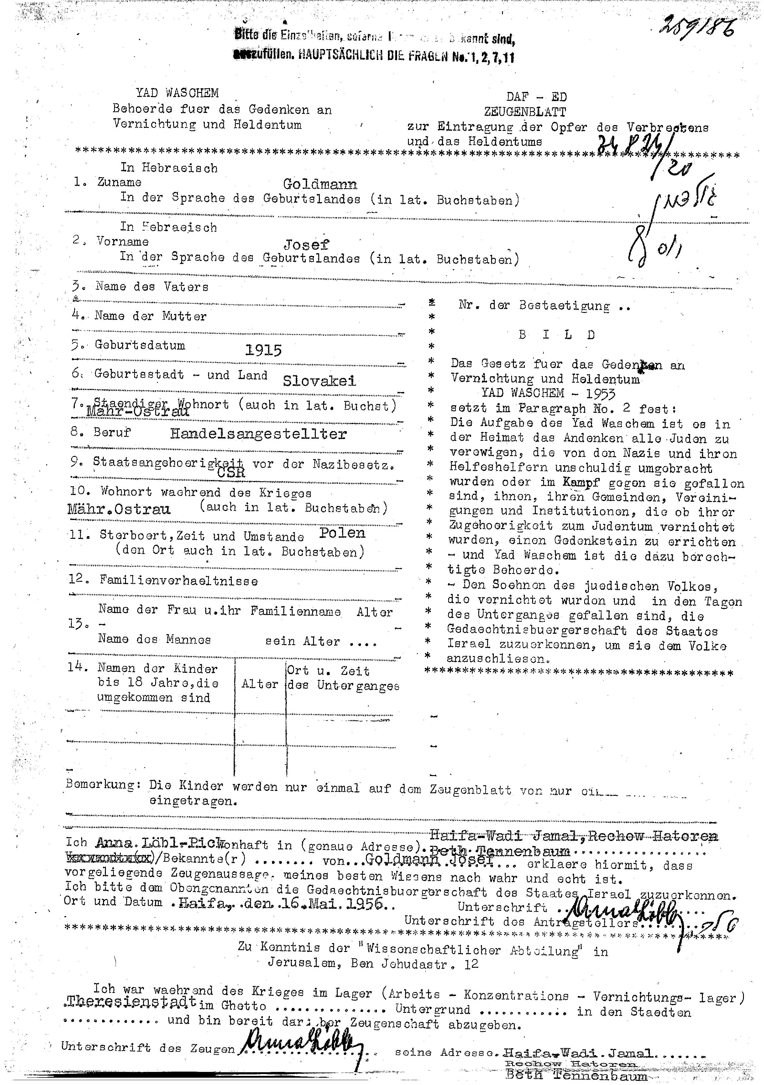 Josef Goldmann wurde im Jahr 1915 in Slovakia, Tschechoslowakei geboren. Er war Angestellte/-r. Vor dem Zweiten Weltkrieg lebte er in Maehrisch Ostrau, Tschechoslowakei. Während des Krieges war er in Maehrisch Ostrau, Tschechoslowakei.