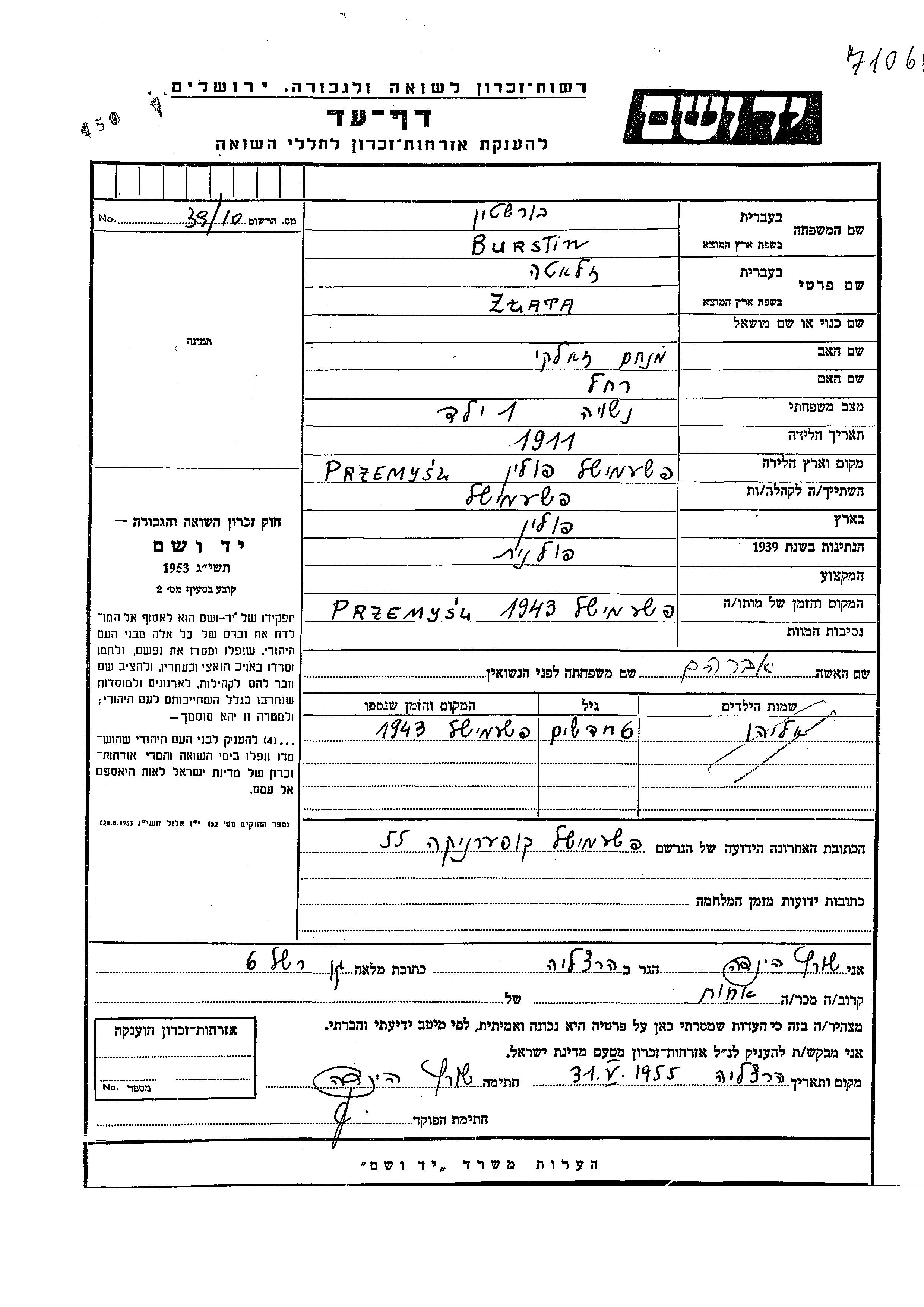 Eliahu Burstin wurde Er war der Sohn von Avraham und Zlata. Er war Kind. Vor dem Zweiten Weltkrieg lebte er in Polen. Während des Krieges war er in Przemysl, Polen.