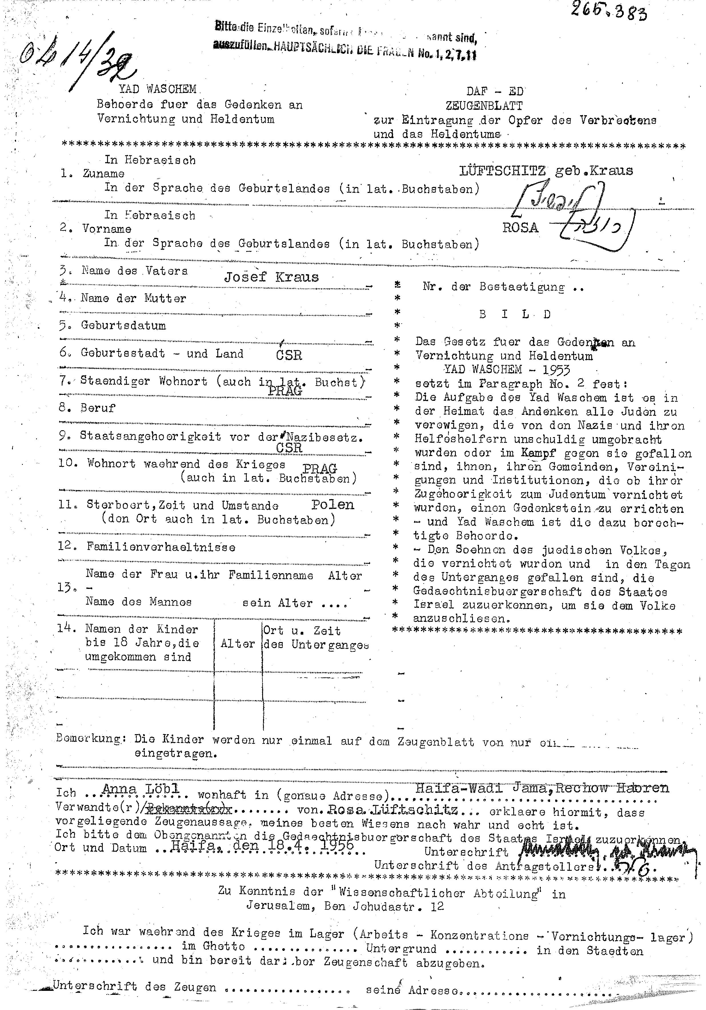Rosa Luftschitz, geb. Kraus wurde in Tschechoslowakei geboren. Sie war die Tochter von Josef. Vor dem Zweiten Weltkrieg lebte sie in Prag, Tschechoslowakei. Während des Krieges war sie in Prag, Tschechoslowakei.
