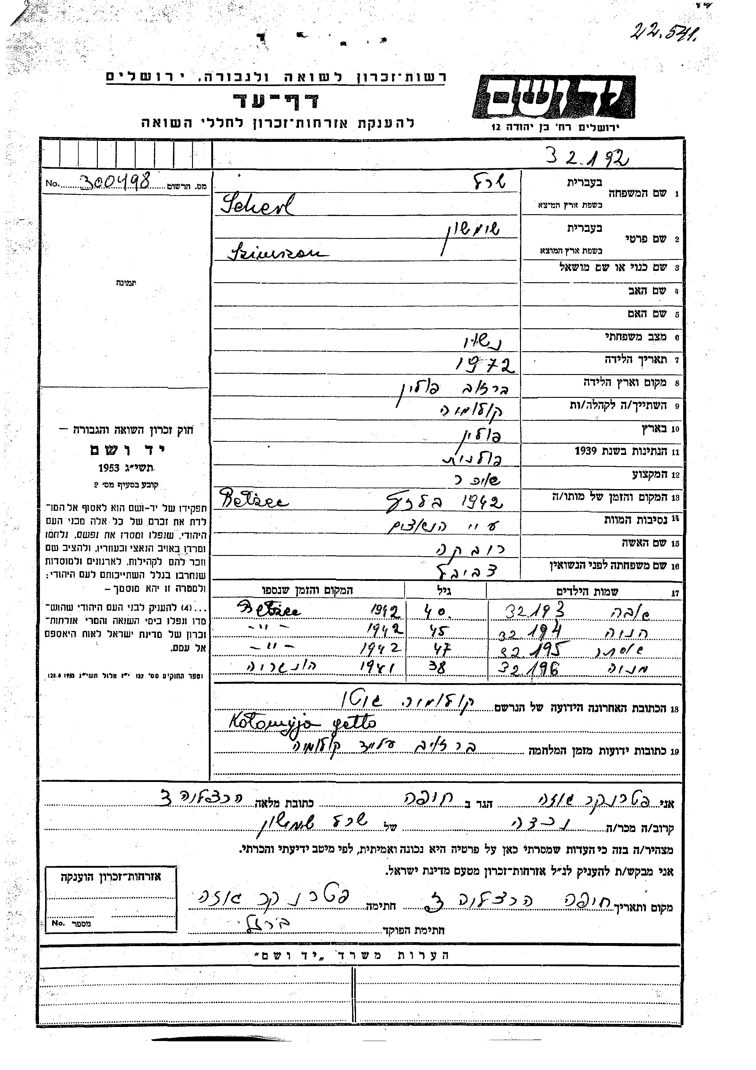 Henia Scherl wurde Er/sie war der/ die Sohn/Tochter von Szimszon und Rivka, geb. Tzvibel. Vor dem Zweiten Weltkrieg er/sie in Kolomyja, Polen. Während des Krieges war er/sie in Berezów, Polen.