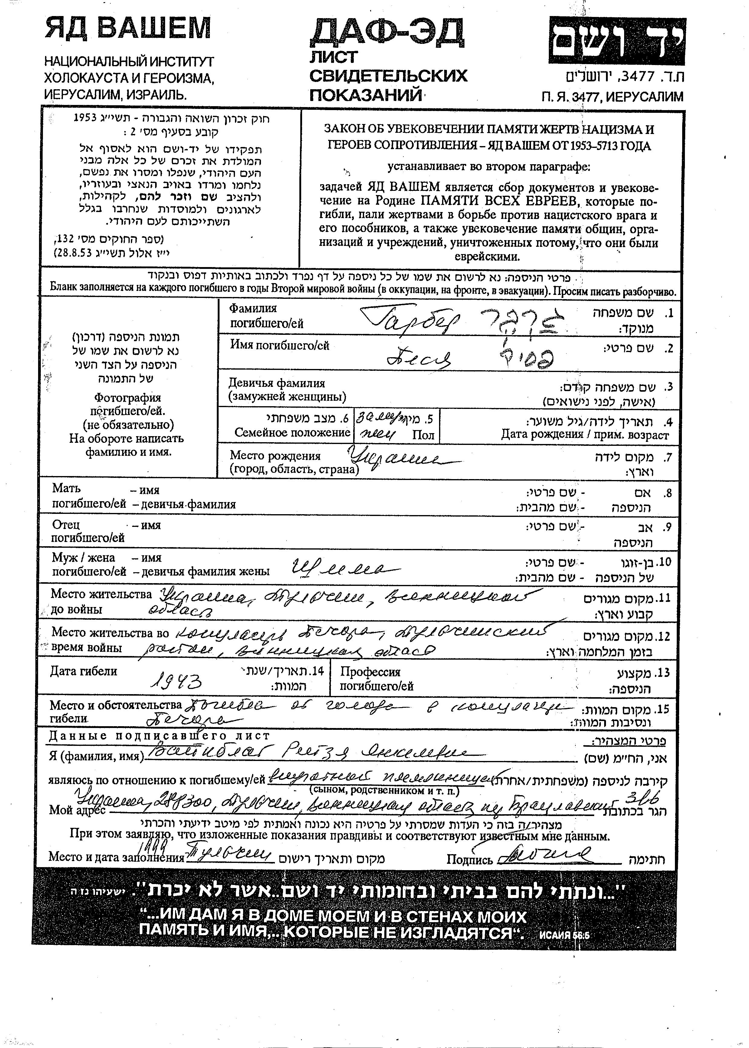 Garbar Graber Pesya Tulchin, Ukraine (UdSSR) Gedenkblatt