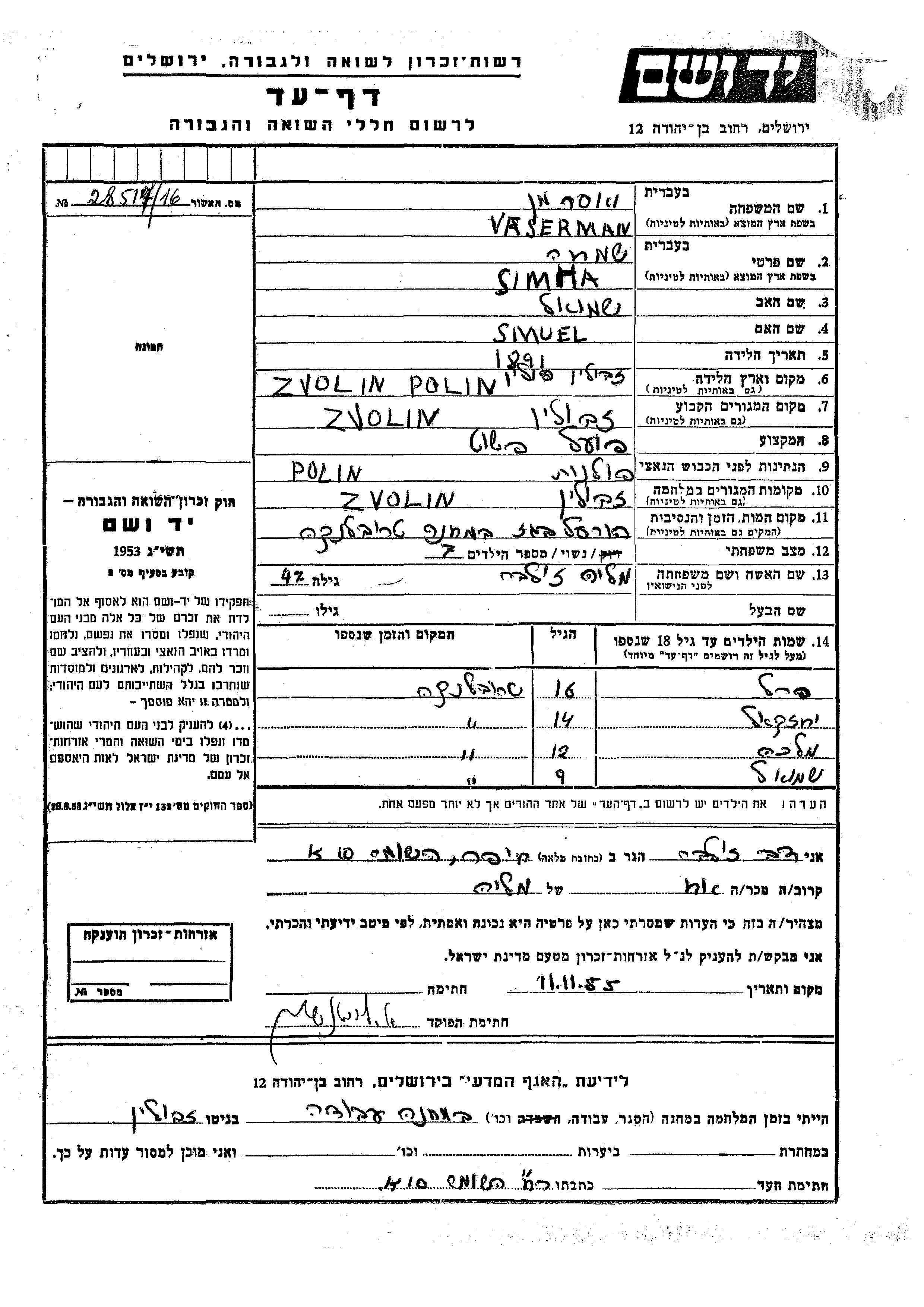 Vaserman Malka Zvolin, Polen Gedenkblatt