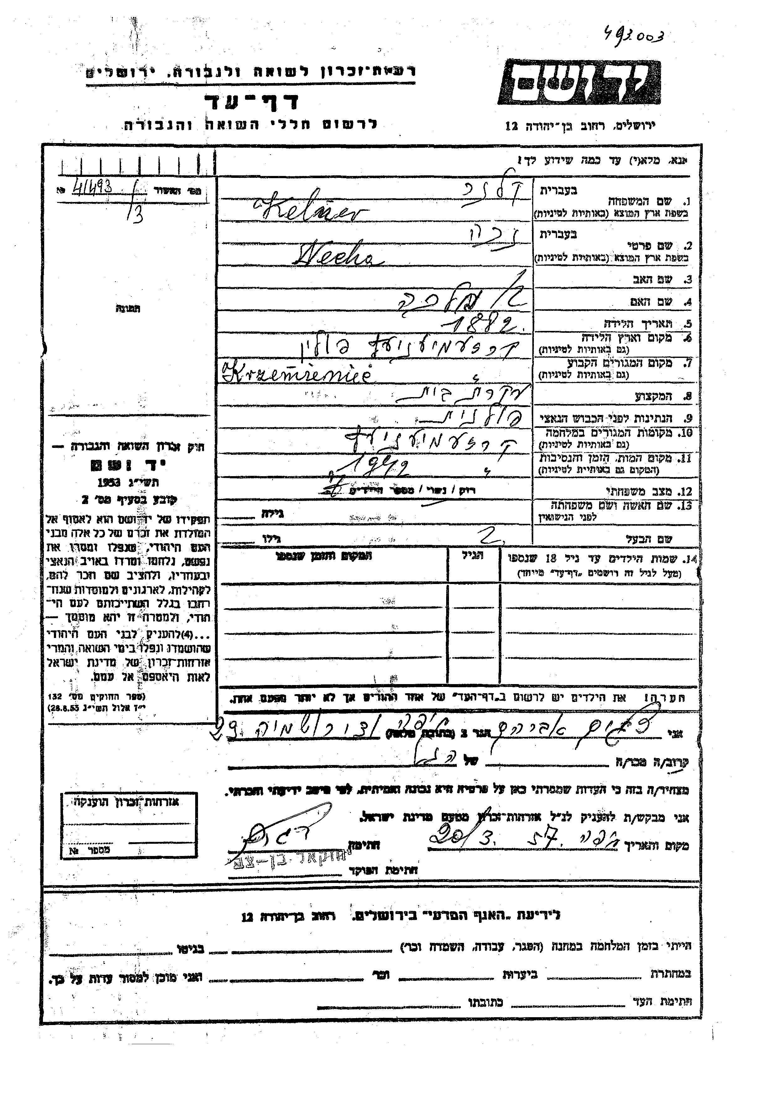 Necha Kelner Klaner wurde im Jahr 1882 in Krzemieniec, Polen geboren. Sie war die Tochter von Malka. Sie war Hausfrau und Verheiratet. Vor dem Zweiten Weltkrieg lebte sie in Krzemieniec, Polen. Während des Krieges war sie in Krzemieniec, Polen.