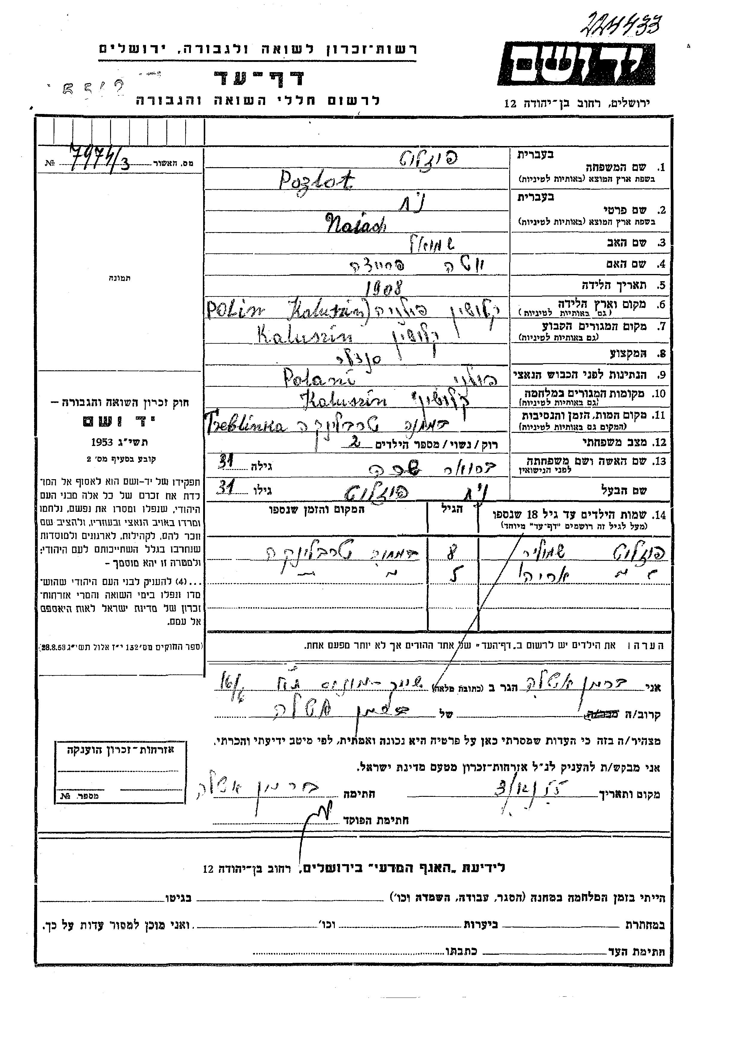 Shmuel Pozlot wurde Er war der Sohn von Noiach und Sara, geb. Bruher. Er war Kind. Vor dem Zweiten Weltkrieg lebte er in Kaluszyn, Polen. Während des Krieges war er in Kaluszyn, Polen.
