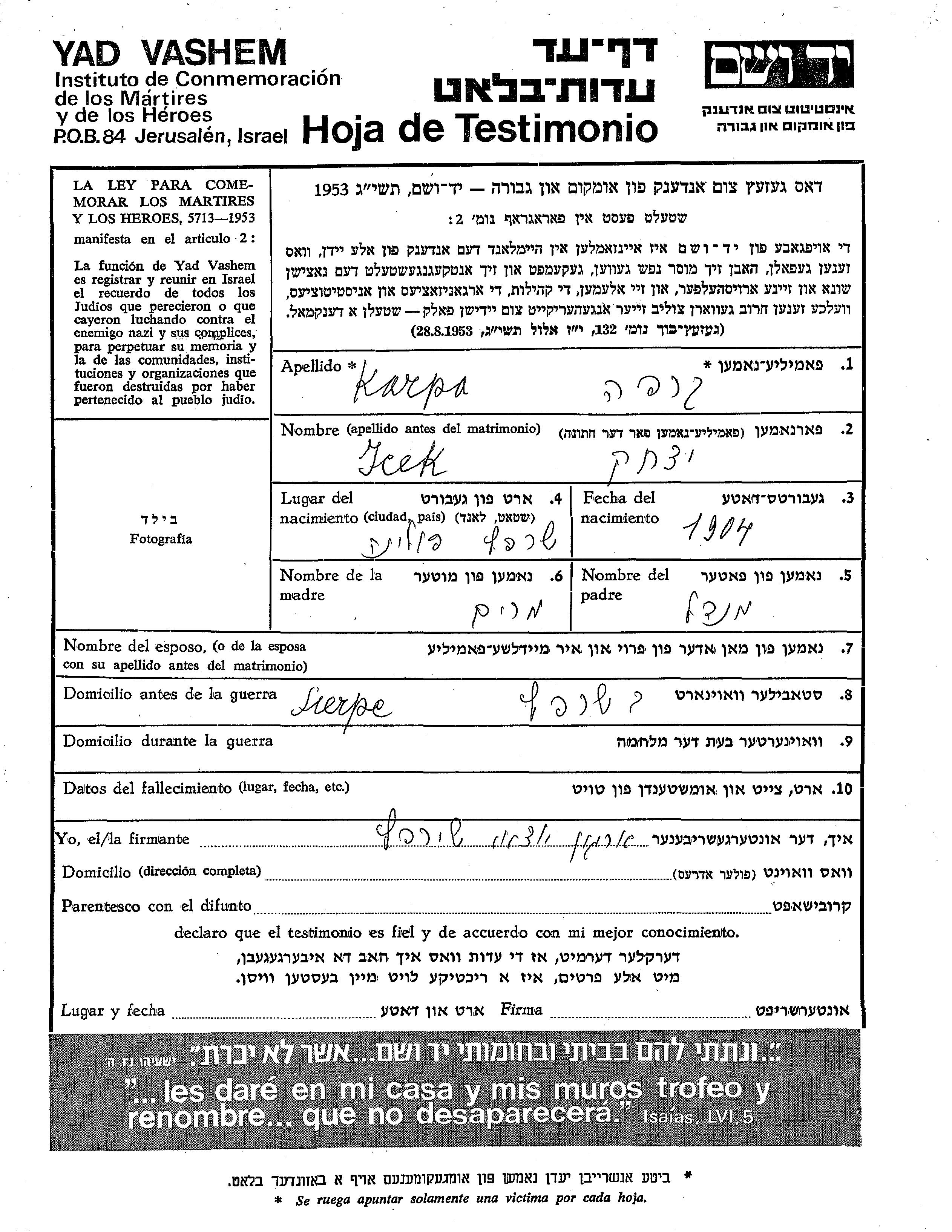 Jcek Karpa wurde im Jahr 1904 in Sierpc, Polen geboren. Er war der Sohn von Mendel und Miriam. Vor dem Zweiten Weltkrieg lebte er in Sierpc, Polen.