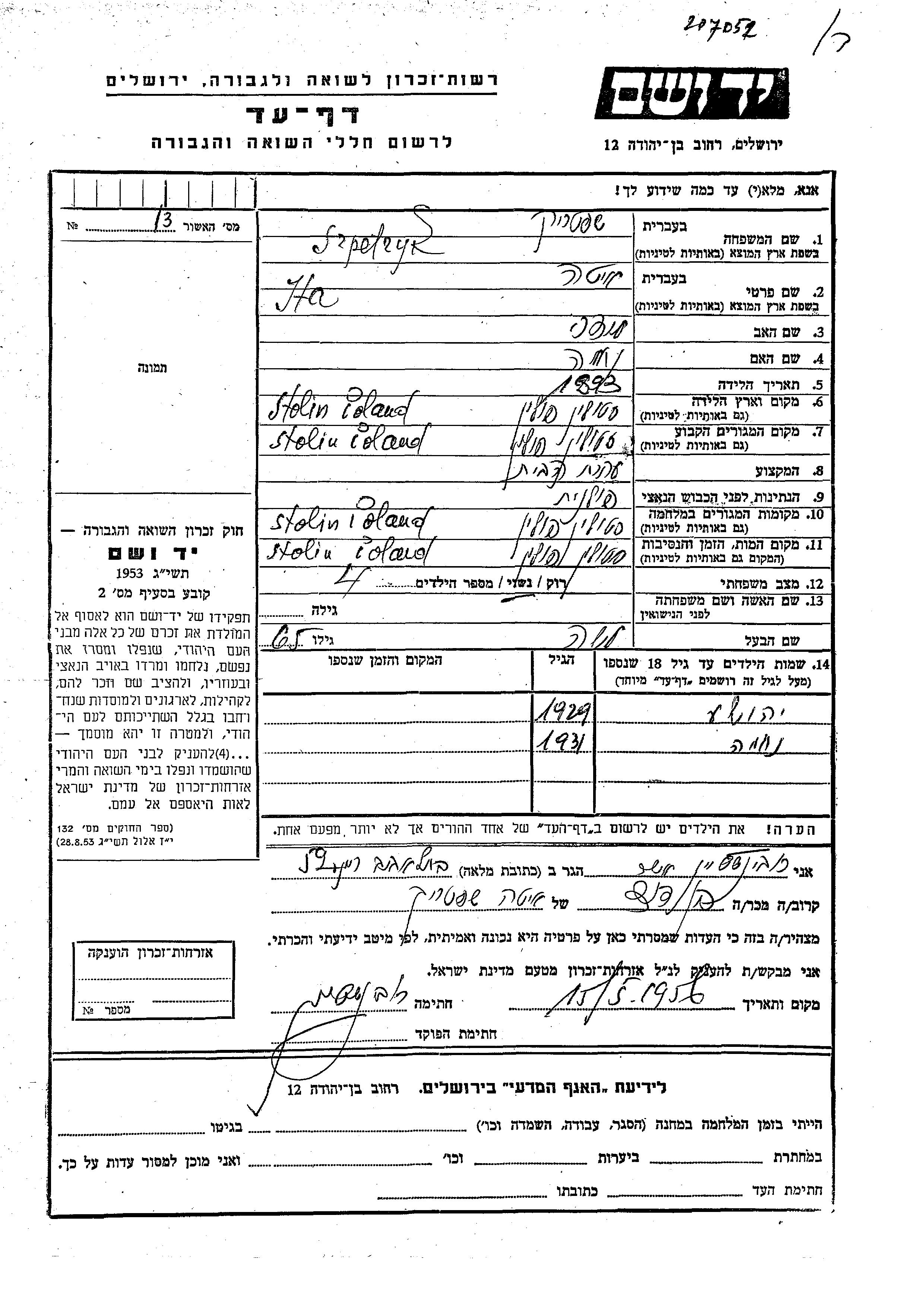 Yehoshua Szpetryk wurde Er war der Sohn von Moshe und Ita. Er war Kind. Vor dem Zweiten Weltkrieg lebte er in Stolin, Polen. Während des Krieges war er in Stolin, Polen.