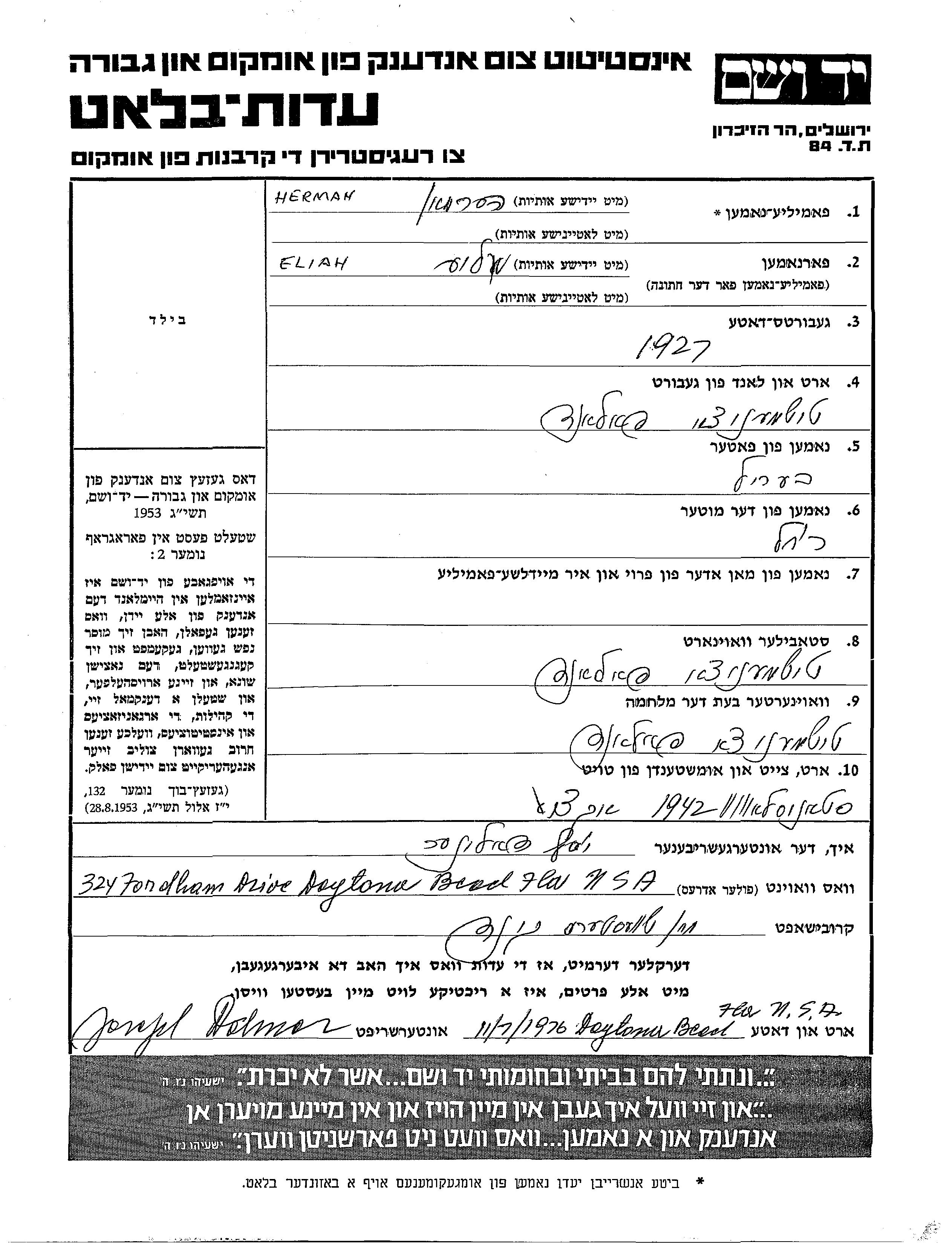 Eliah Herman wurde im Jahr 1927 in Tismenitsya, Polen geboren. Er war der Sohn von Beril und Rakhel. Vor dem Zweiten Weltkrieg lebte er in Tismenitsya, Polen. Während des Krieges war er in Tismenitsya, Polen.