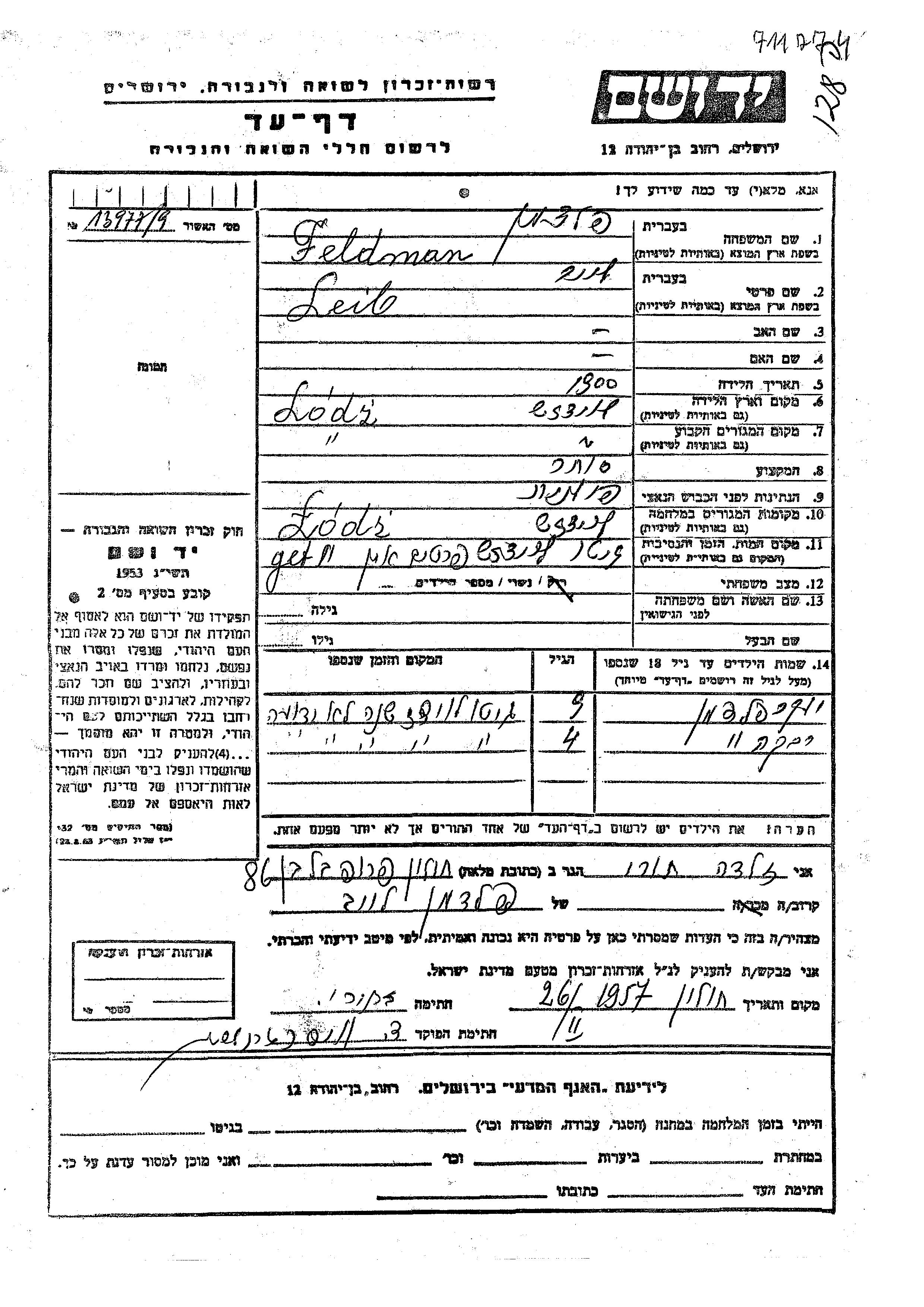 Yaakov Feldman wurde Er war der Sohn von Leib. Er war Kind. Vor dem Zweiten Weltkrieg lebte er in Lodz, Polen. Während des Krieges war er in Lodz, Polen.