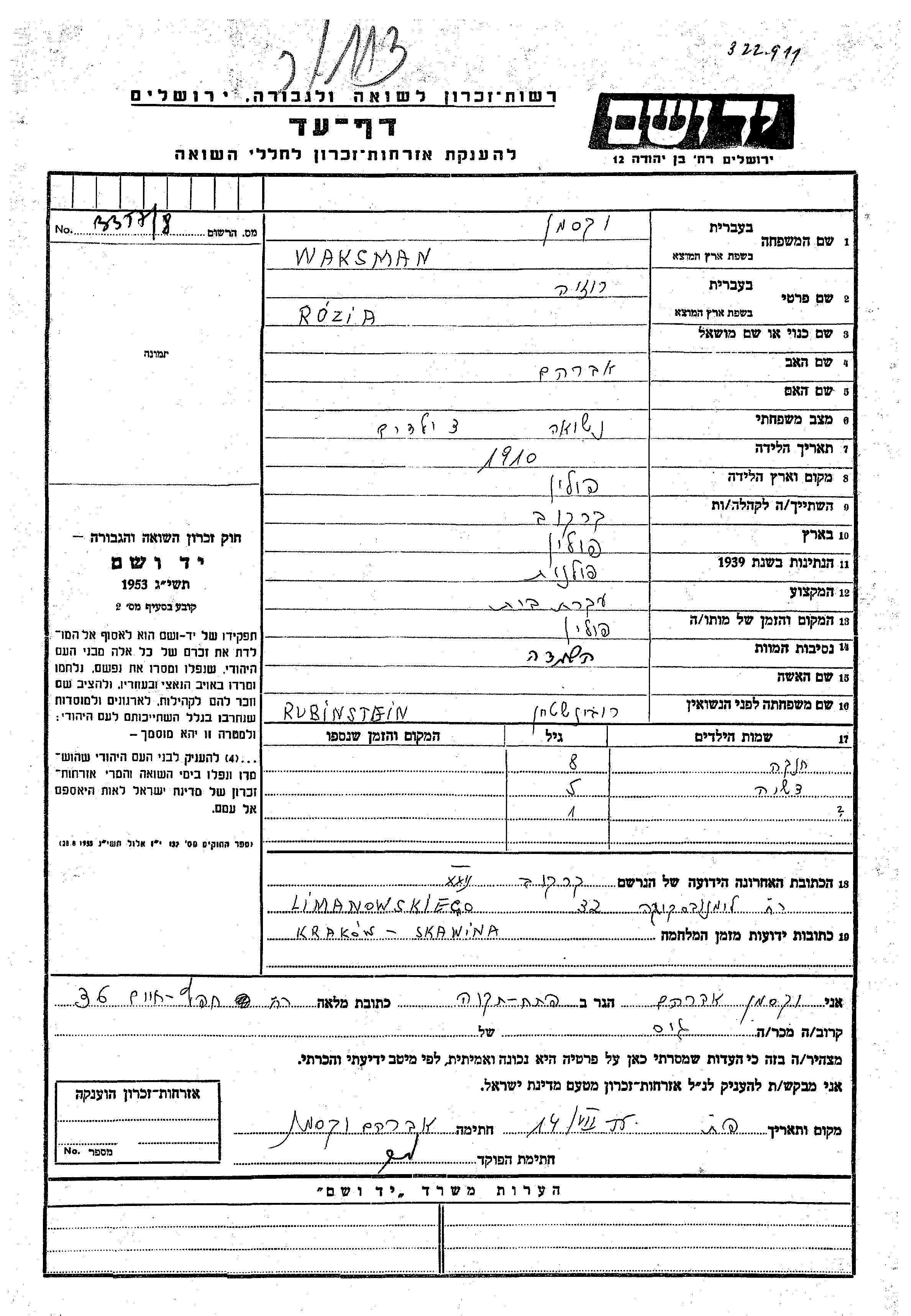 Dashia Waksman wurde Er war der Sohn von Rozia, geb. Rubinstein. Er war Kind. Vor dem Zweiten Weltkrieg lebte er in Krakow, Polen. Während des Krieges war er in Skawina, Polen.