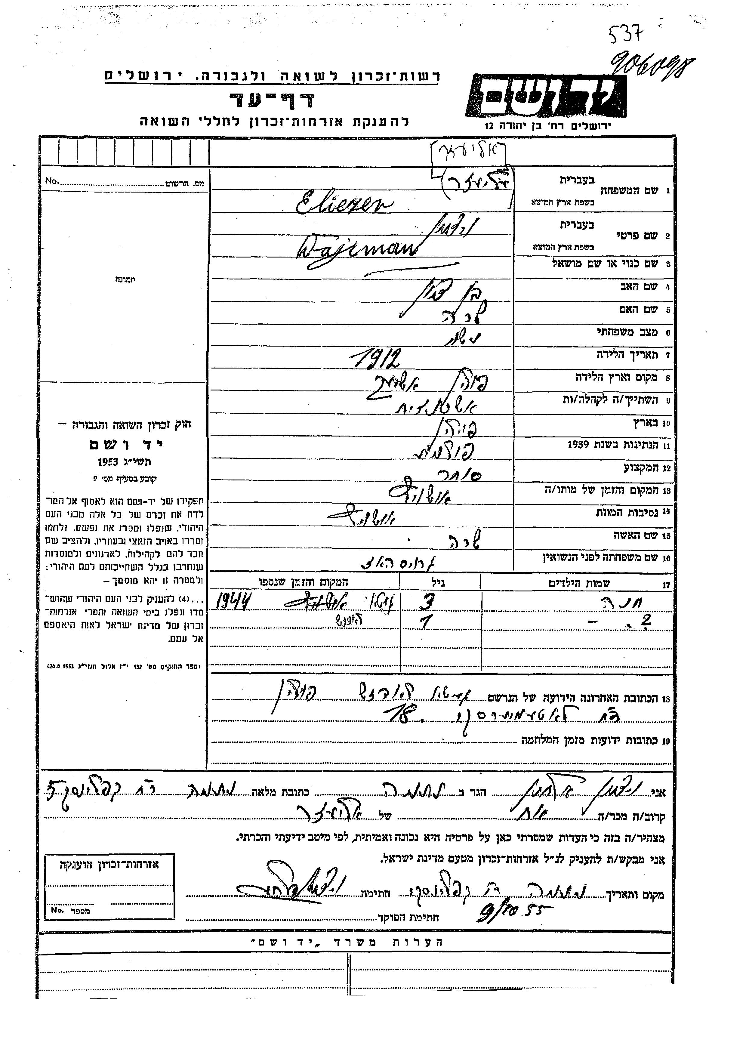 Vorname unbekannt Wajcman wurde Er/sie war der/ die Sohn/Tochter von Eliezer und Sara, geb. Groshaus. Er/Sie war Kind. Vor dem Zweiten Weltkrieg er/sie in Polen. Während des Krieges war er/sie in Polen.