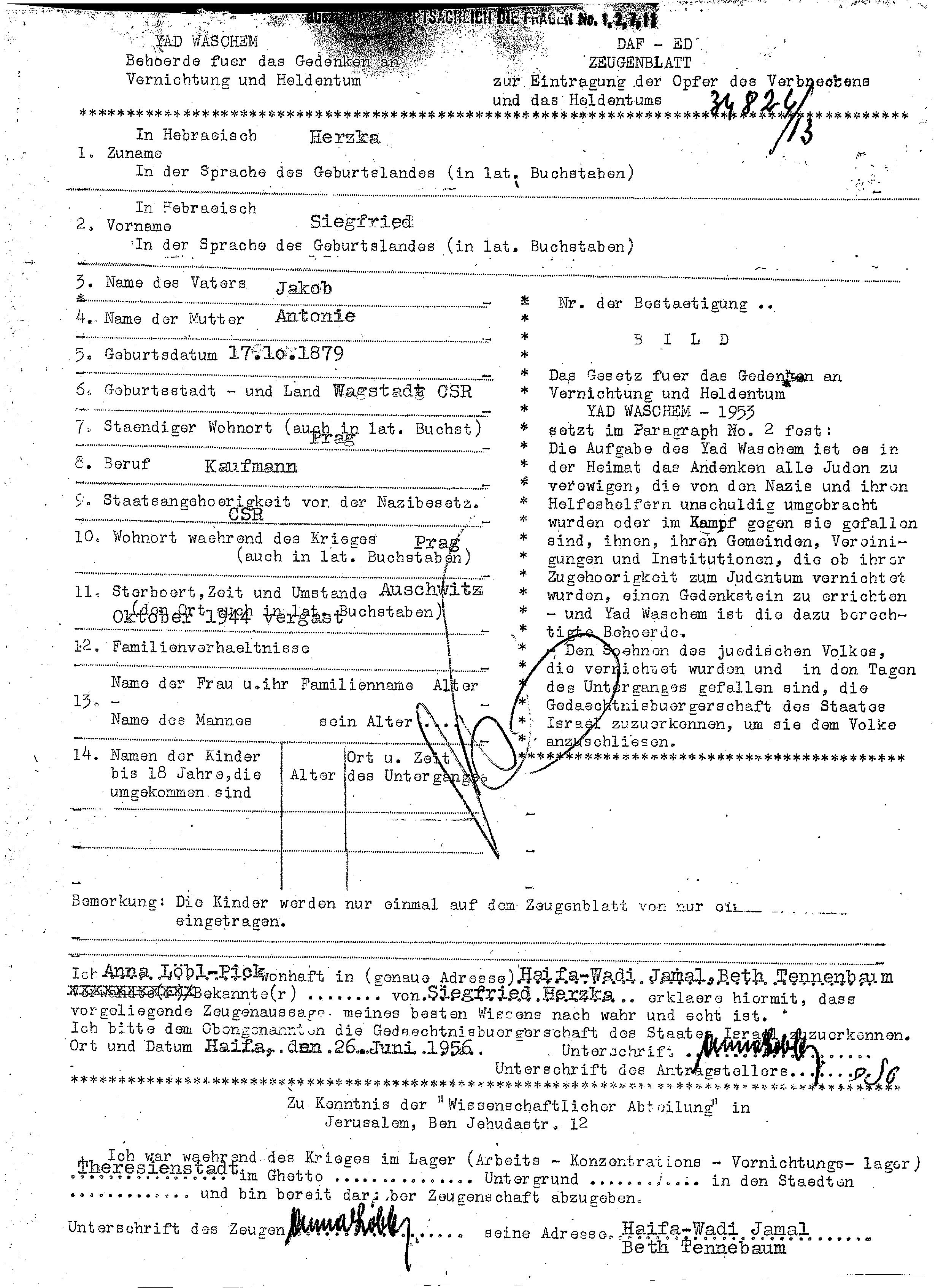 Siegfried Herzka wurde im Jahr 1879 in Wagstadt, Tschechoslowakei geboren. Er war der Sohn von Jakob und Antonie. Er war Kaufmann/-frau. Vor dem Zweiten Weltkrieg lebte er in Prague, Tschechoslowakei. Während des Krieges war er in Prague, Tschechoslowakei.