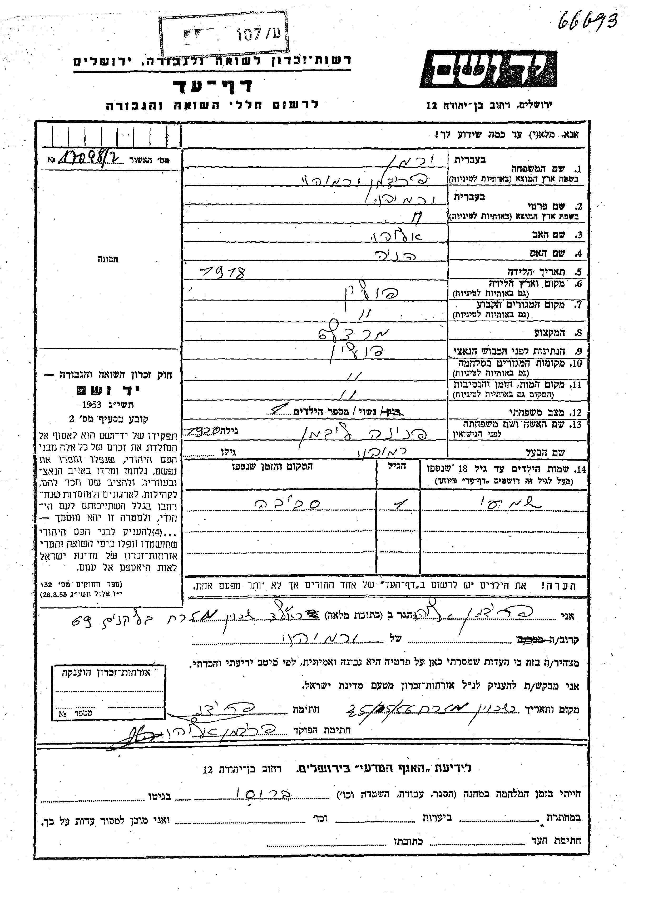Shamai Ierman Fridman wurde Er war der Sohn von Yermiyahu und Pnina, geb. Libman. Er war Kind. Vor dem Zweiten Weltkrieg lebte er in Polen. Während des Krieges war er in Polen.
