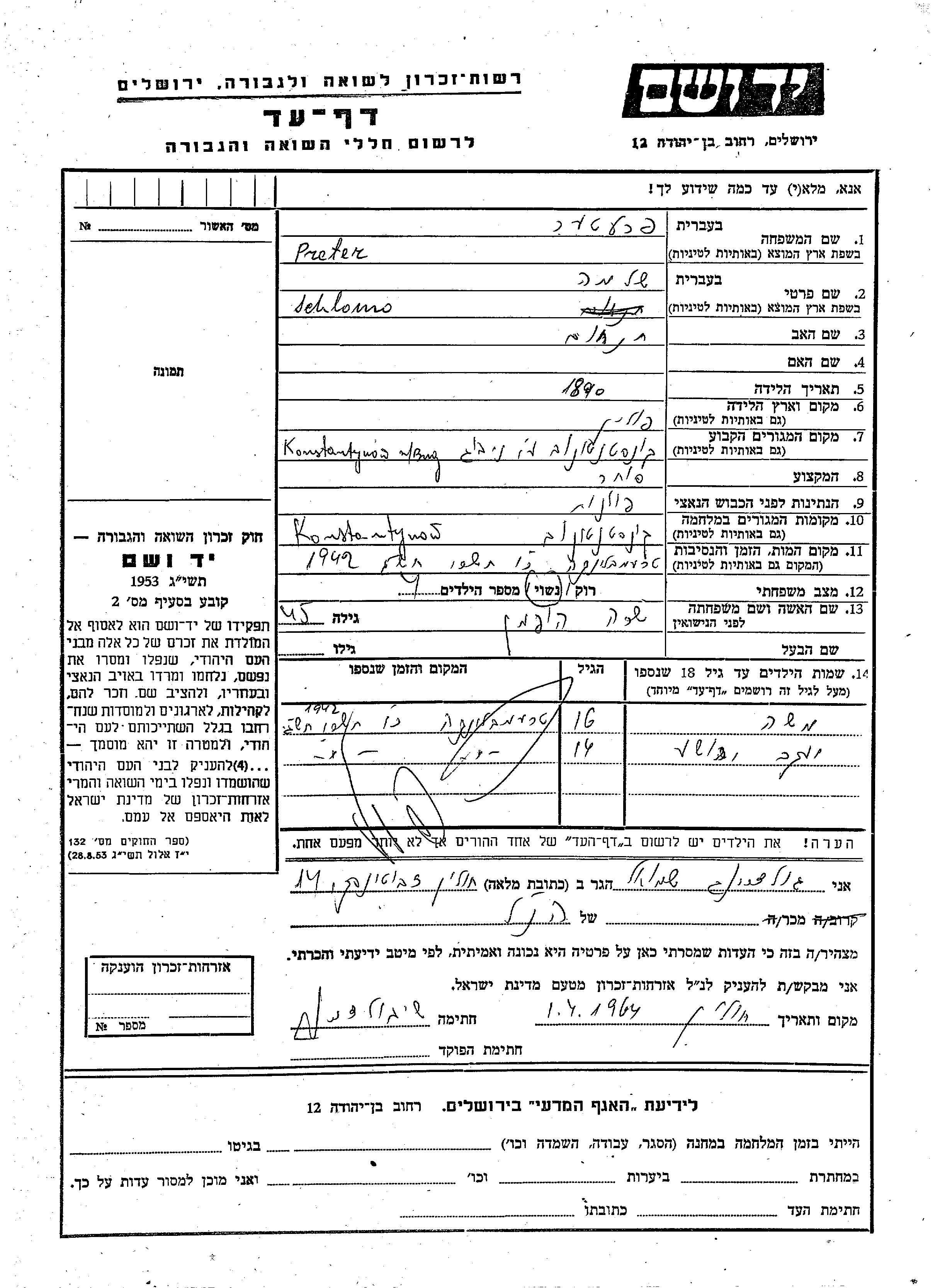 Moshe Preter wurde Er war der Sohn von Schlomo und Sara, geb. Hofman. Er war Kind. Vor dem Zweiten Weltkrieg lebte er in Konstantynow nad Bugiem, Polen. Während des Krieges war er in Konstantynow nad Bugiem, Polen.