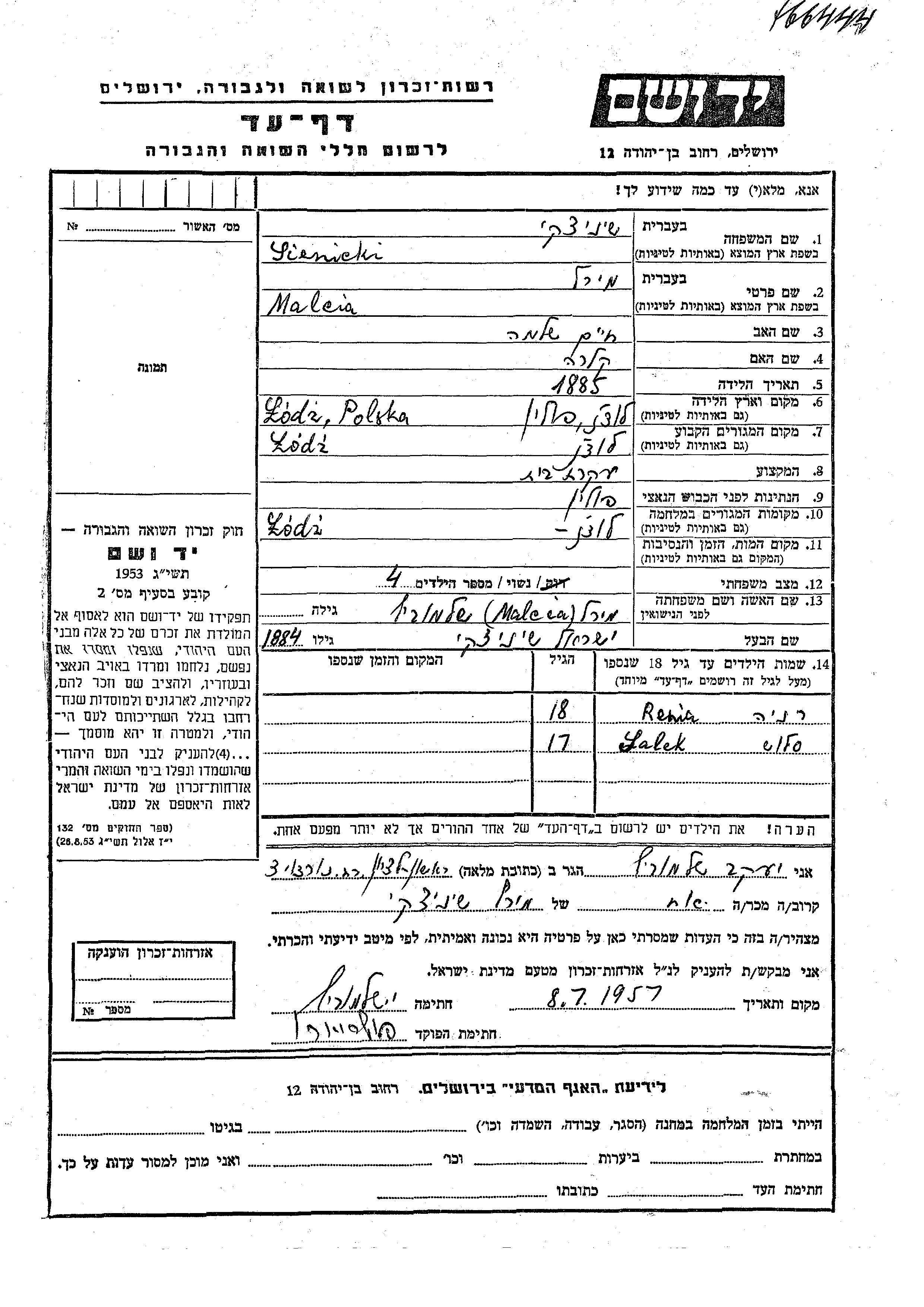 Reina Sienicki wurde Sie war die Tochter von Yisrael und Malcia Mirl, geb. Shlamovitz. Sie war Kind. Vor dem Zweiten Weltkrieg lebte sie in Lodz, Polen. Während des Krieges war sie in Lodz, Polen.