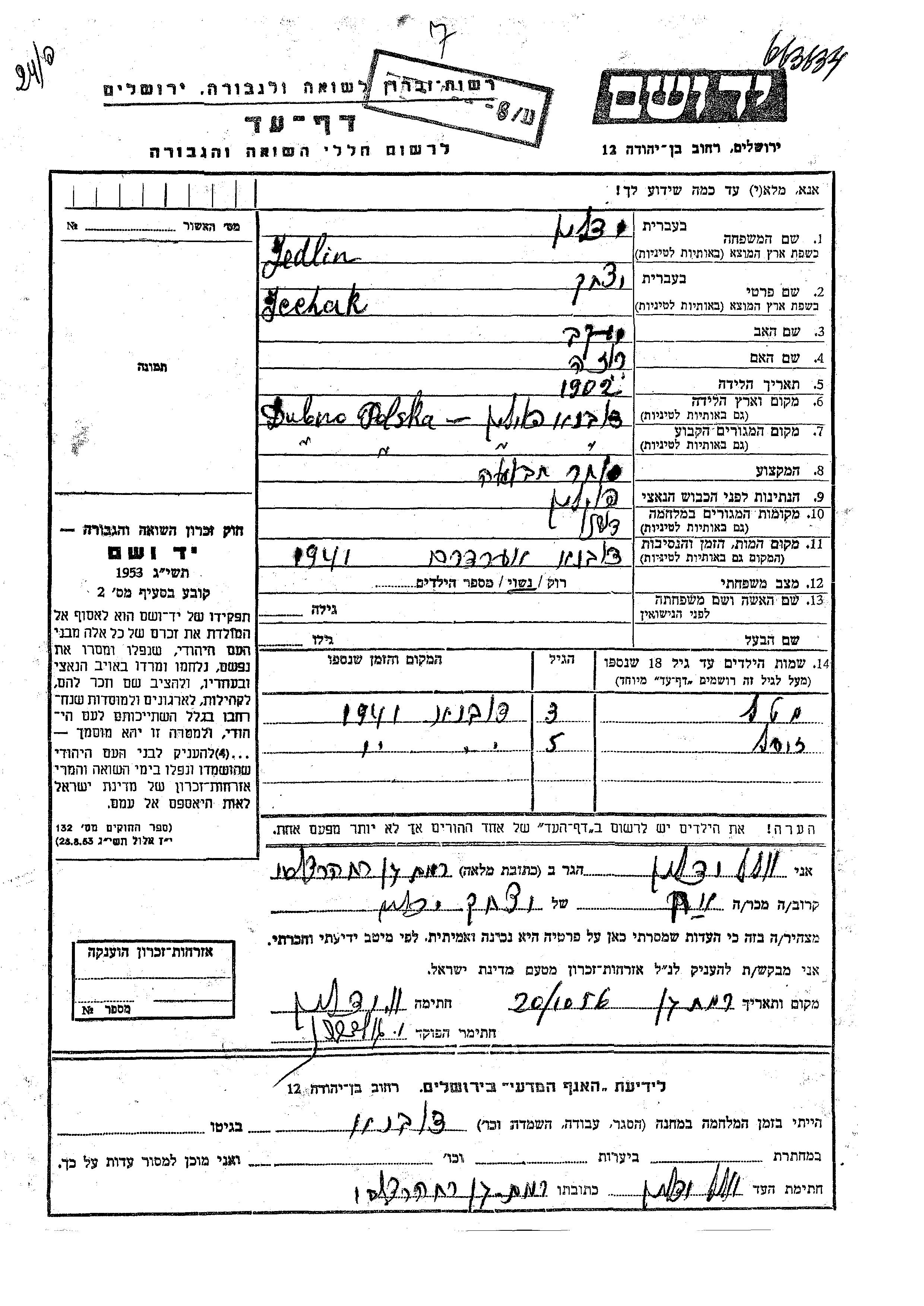 Zusel Yedlin wurde Er/sie war der/ die Sohn/Tochter von Icchak. Er/Sie war Kind. Vor dem Zweiten Weltkrieg er/sie in Dubno, Polen. Während des Krieges war er/sie in Dubno, Polen.
