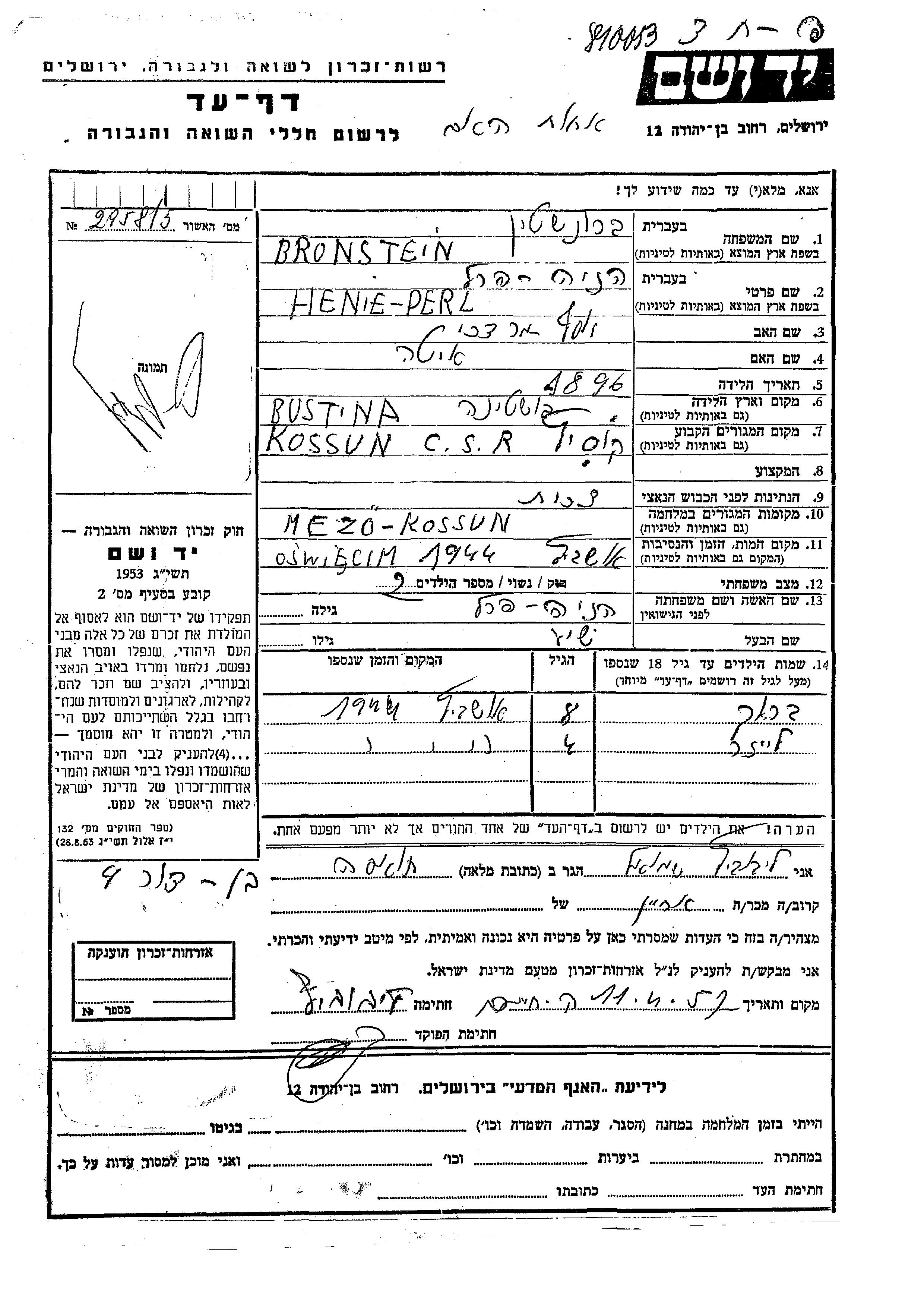 Barukh Bronstein wurde Er war der Sohn von Yehoshua und Henie Perl Henia, geb. Perl. Er war Kind. Vor dem Zweiten Weltkrieg lebte er in Mezokaszony, Tschechoslowakei. Während des Krieges war er in Mezokaszony, Tschechoslowakei.