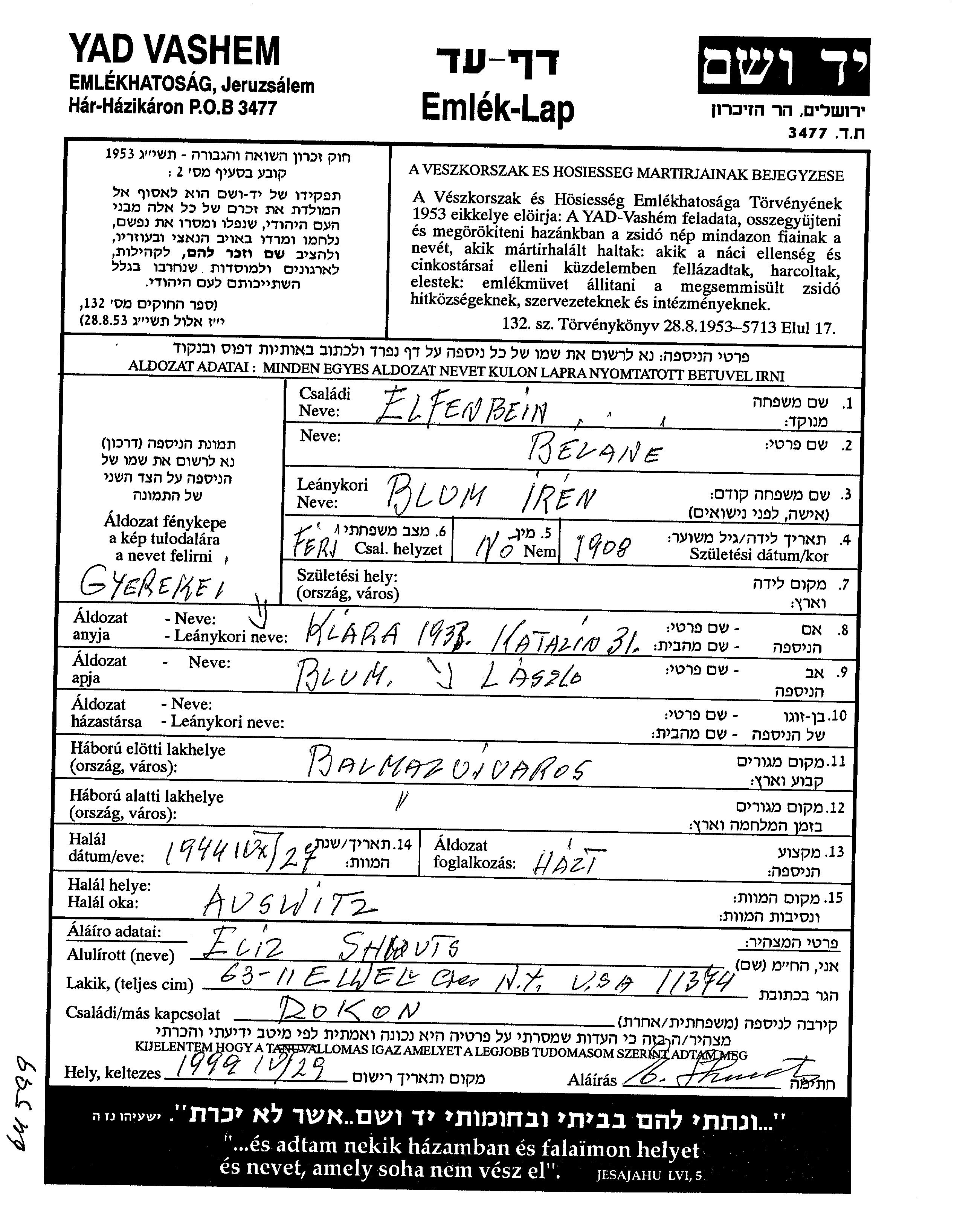Katalin Elfenbein wurde Sie war die Tochter von Bela und Iren, geb. Blum. Sie war Kind. Vor dem Zweiten Weltkrieg lebte sie in Balmaz-Ujvaros, Ungarn. Während des Krieges war sie in Balmaz-Ujvaros, Ungarn.