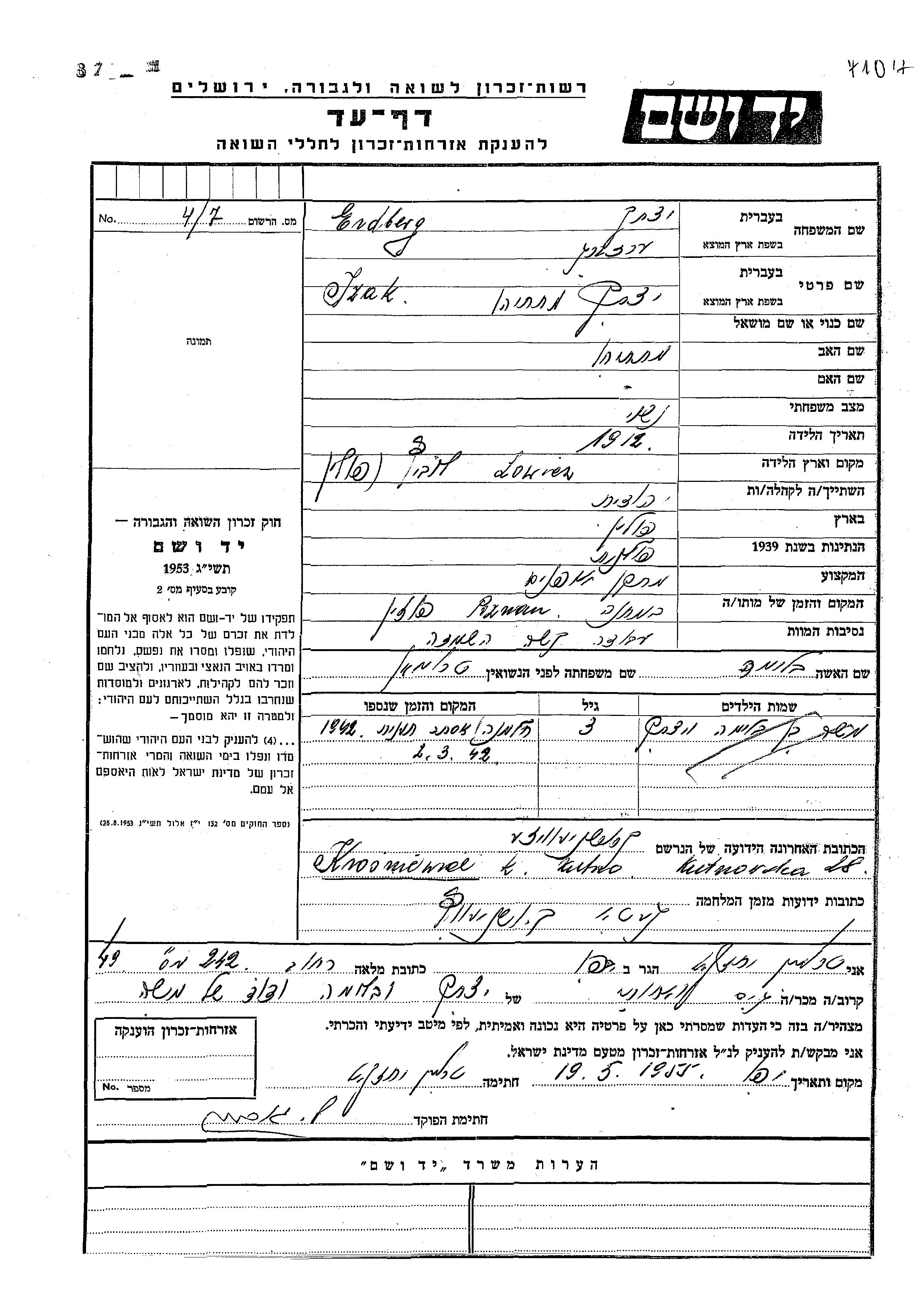Moshe Erdberg wurde Er war der Sohn von Izak Matatiahu und Bluma, geb. Troman. Er war Kind. Vor dem Zweiten Weltkrieg lebte er in Polen. Während des Krieges war er in Krosniewice, Polen.