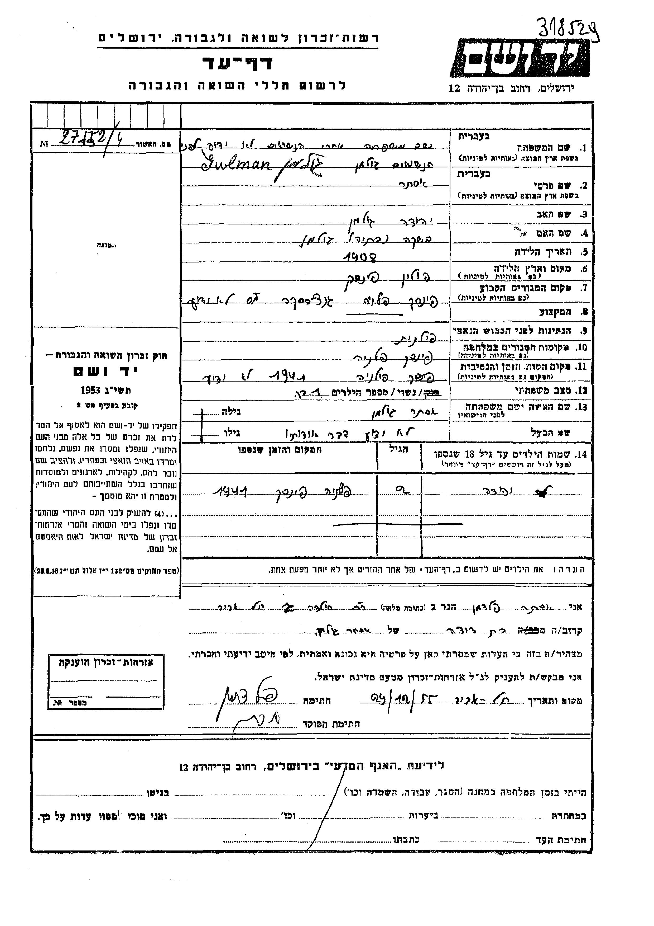 Yehuda Name unbekannt wurde Er war der Sohn von Ester, geb. Gulman. Er war Kind. Vor dem Zweiten Weltkrieg lebte er in Pinsk, Polen. Während des Krieges war er in Pinsk, Polen.