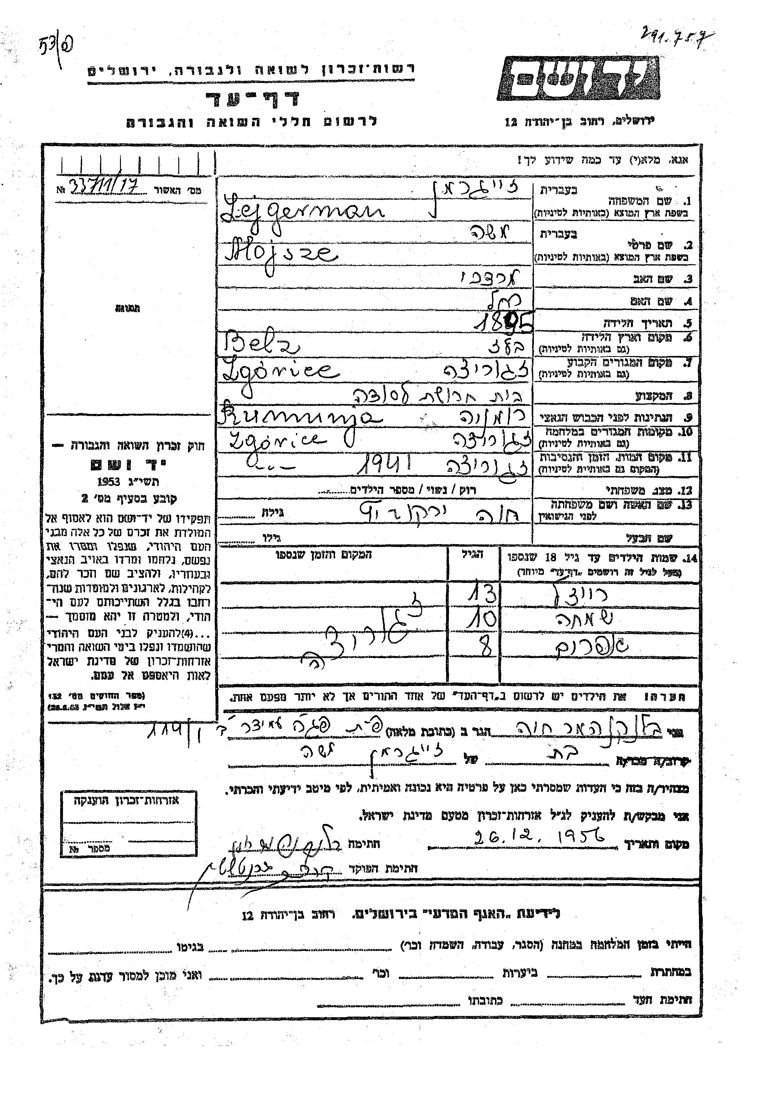 Efraim Zejgerman wurde Er war der Sohn von Mojsze und Khava, geb. Irkovitz. Er war Kind. Vor dem Zweiten Weltkrieg lebte er in Zgurita, Rumänien. Während des Krieges war er in Zgurita, Rumänien.