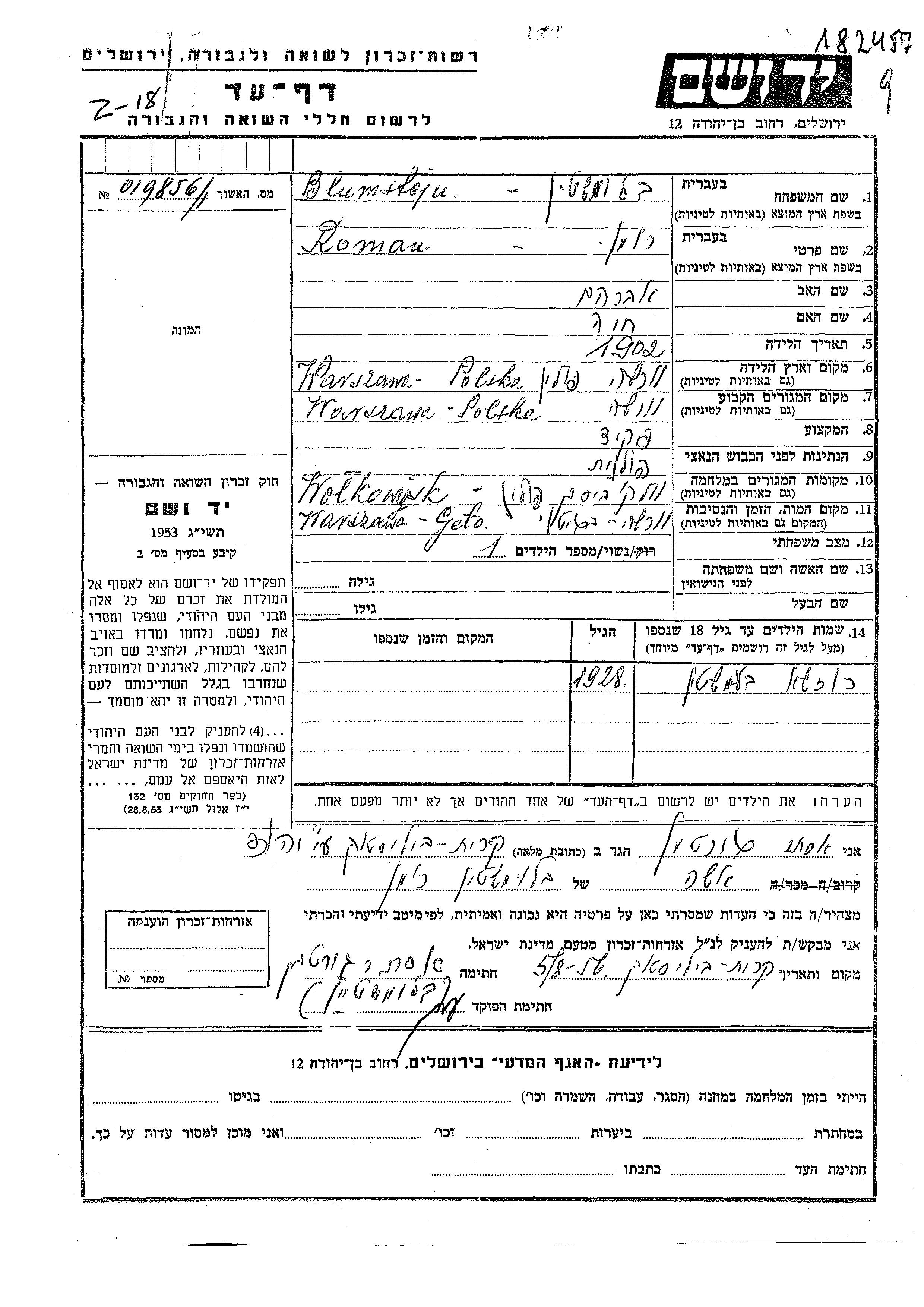 Rozha Blumstejn wurde im Jahr 1928 geboren. Sie war die Tochter von Roman. Sie war Kind. Vor dem Zweiten Weltkrieg lebte sie in Warsaw, Polen. Während des Krieges war sie in Wolkowce ad Borszczow, Polen.