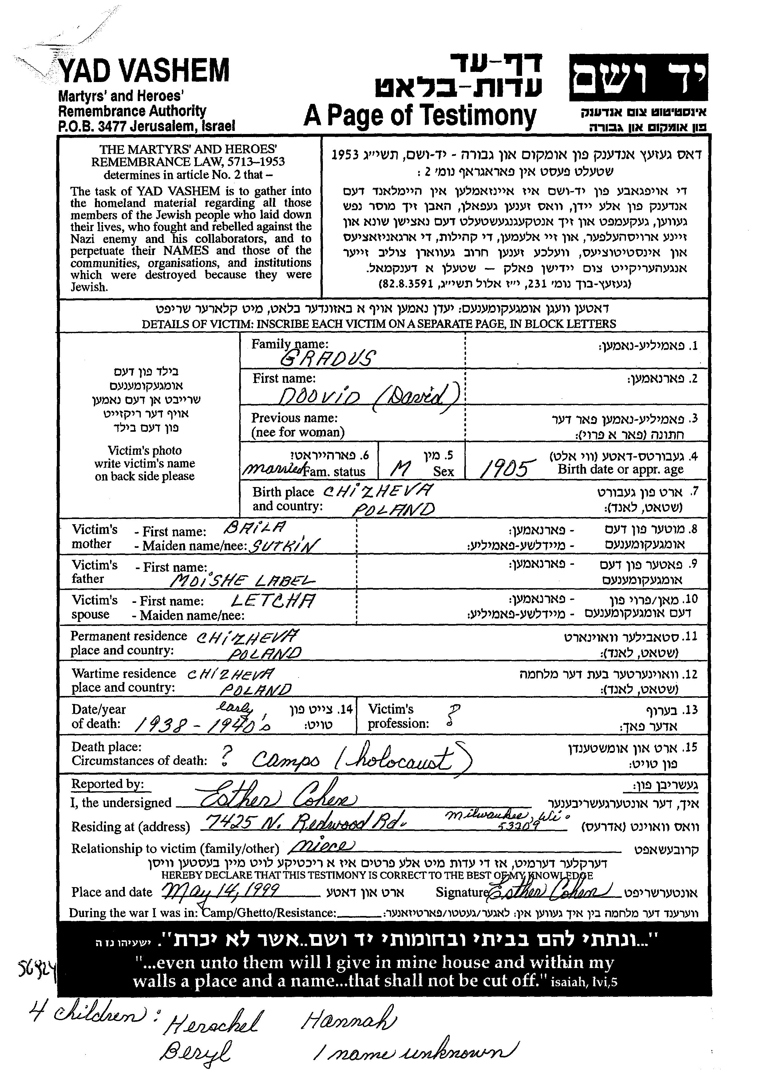 Herschel Gradus wurde Er war der Sohn von Doovid und Letcha. Er war Kind. Vor dem Zweiten Weltkrieg lebte er in Chizheva, Polen. Während des Krieges war er in Chizheva, Polen.