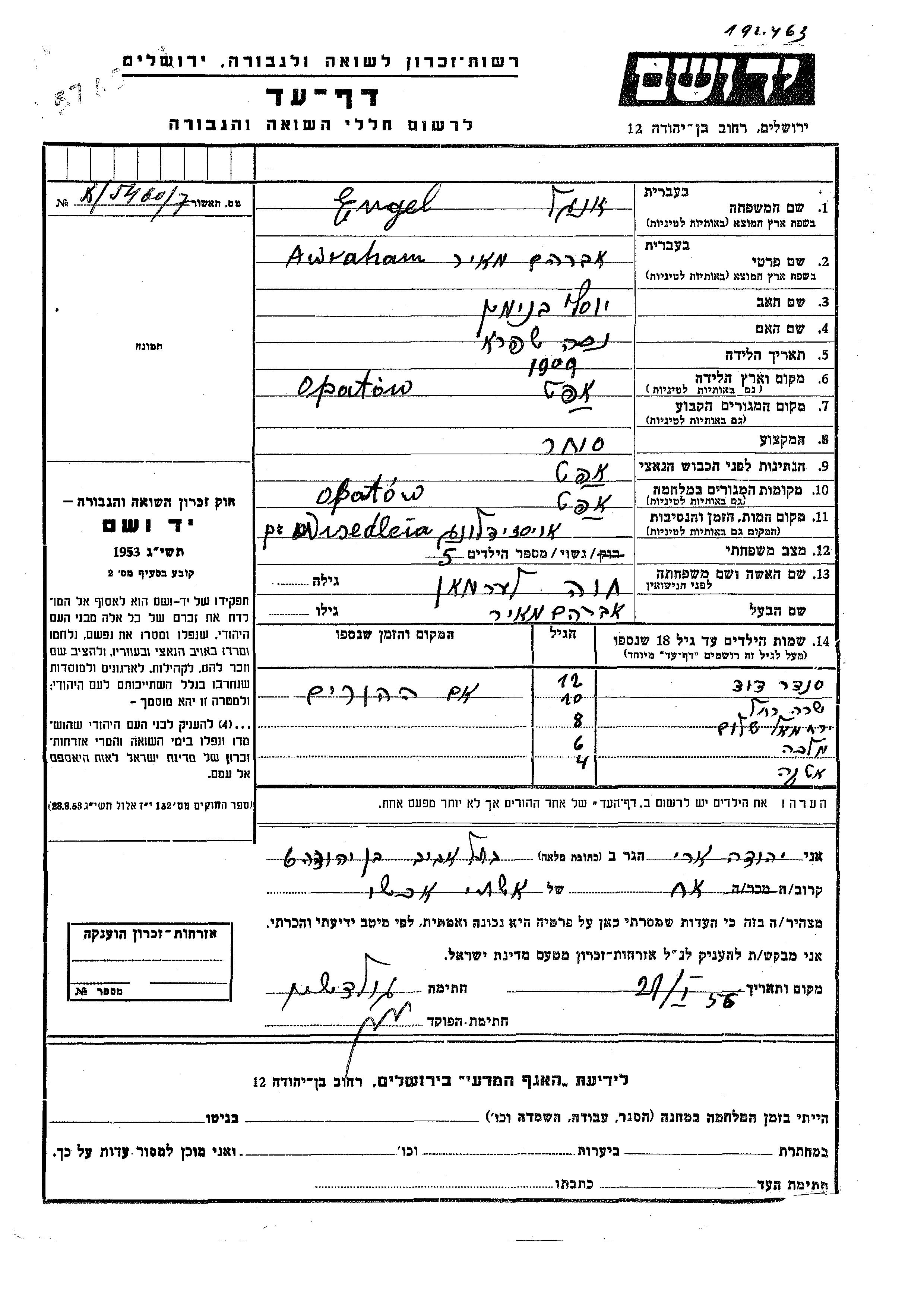 Rakhel Engel wurde Sie war die Tochter von Awraham Meir und Khava, geb. Lerman. Sie war Kind. Während des Krieges war sie in Opatow, Polen.