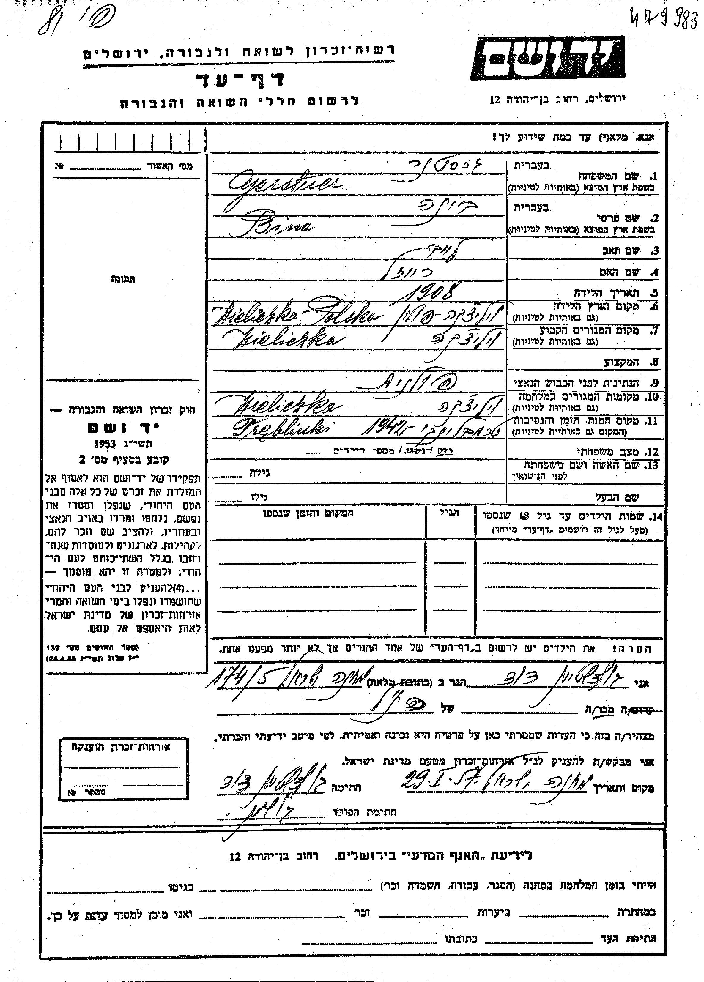 Bina wurde in der Schoah ermordet. Todesort: Treblinka, Polen im Jahr 1942.