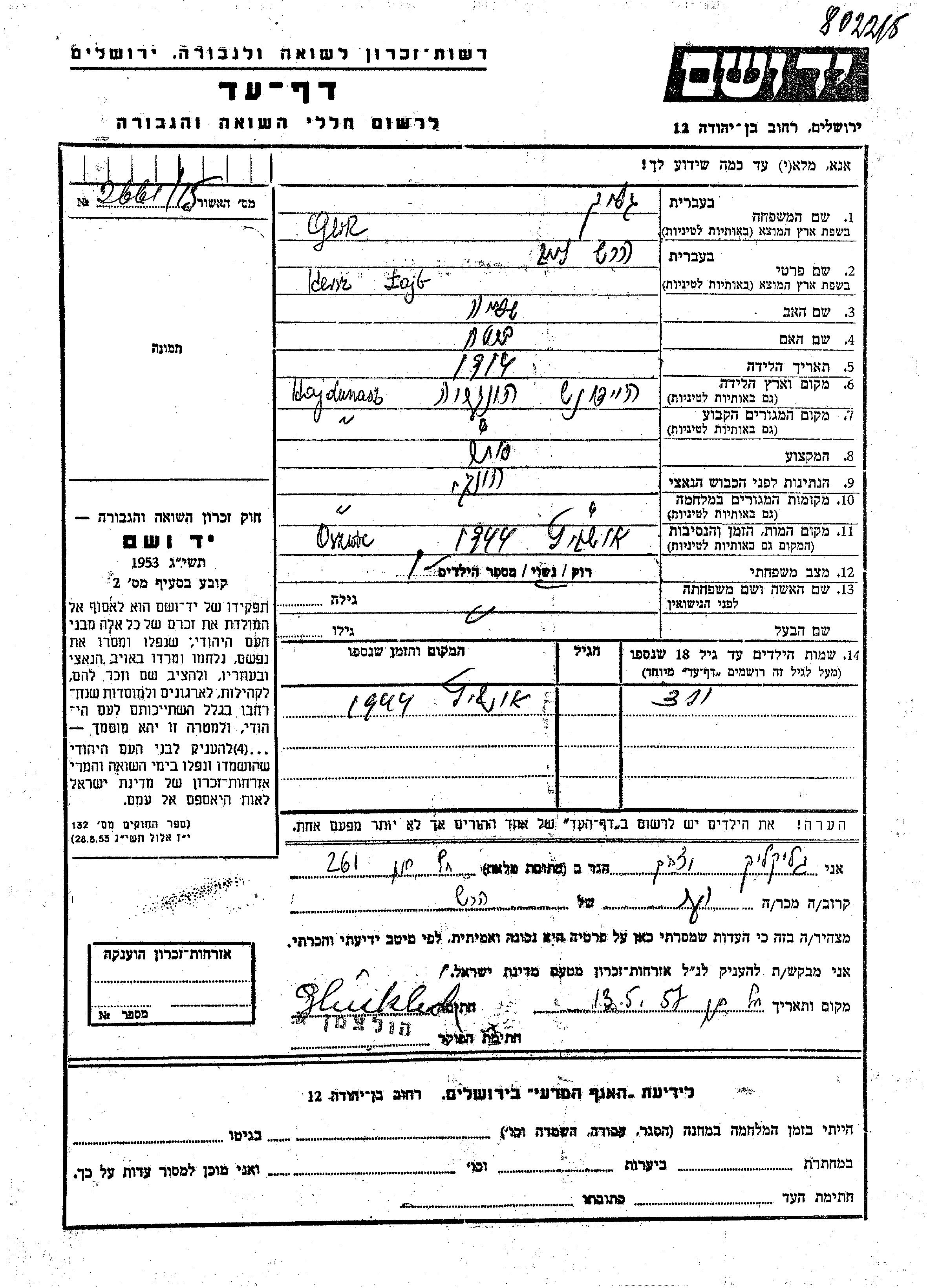 Hersz Lajb Glik wurde im Jahr 1914 in Hajdunasz, Ungarn geboren. Er war der Sohn von Shlomo und Tzita. Er war Kaufmann/-frau und Verheiratet. Vor dem Zweiten Weltkrieg lebte er in Hajdunasz, Ungarn. Während des Krieges war er in Hajdunasz, Ungarn.
