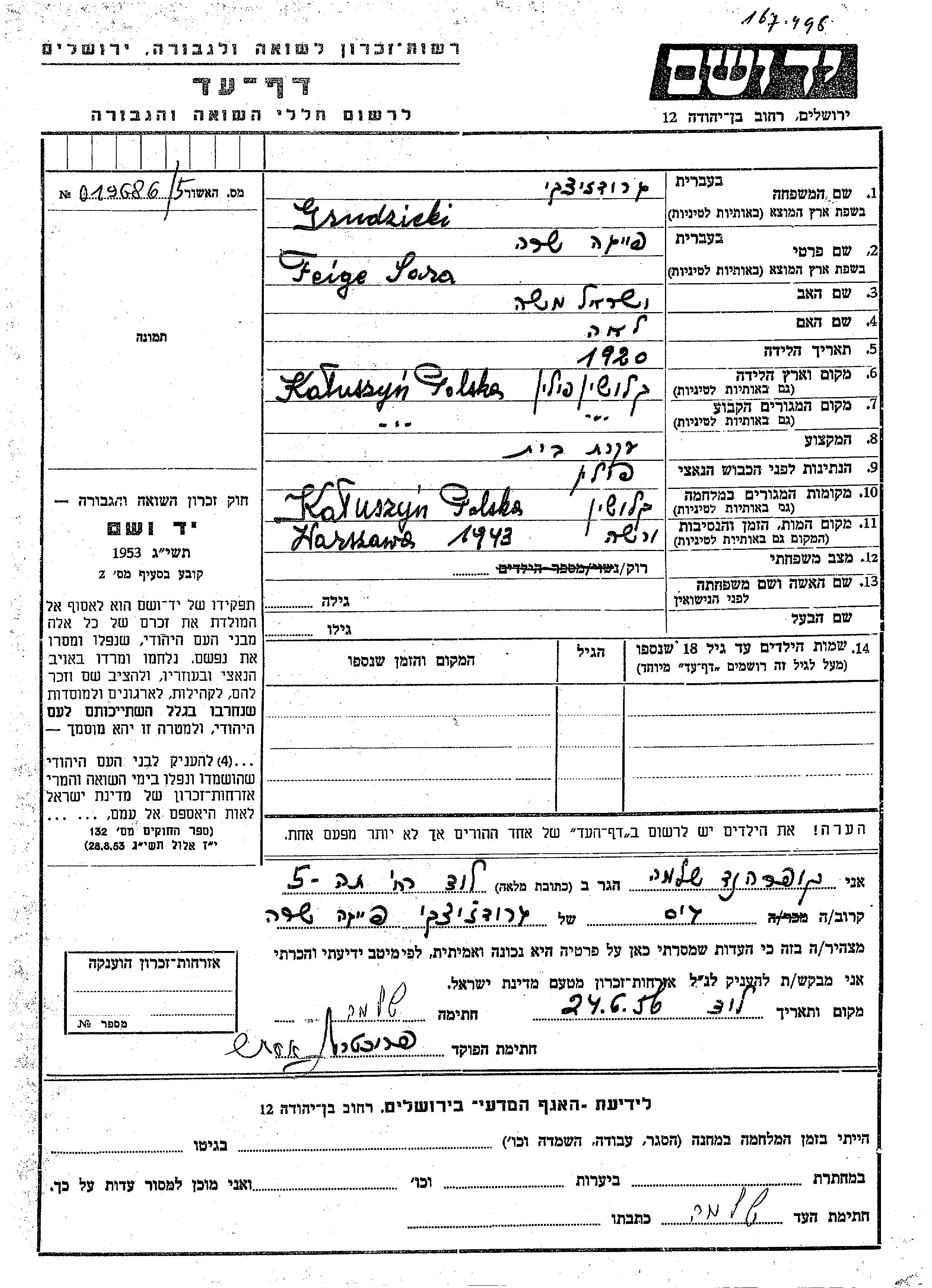 Feiga Sara wurde in der Schoah ermordet. Todesort: Warsaw, Polen im Jahr 1943.