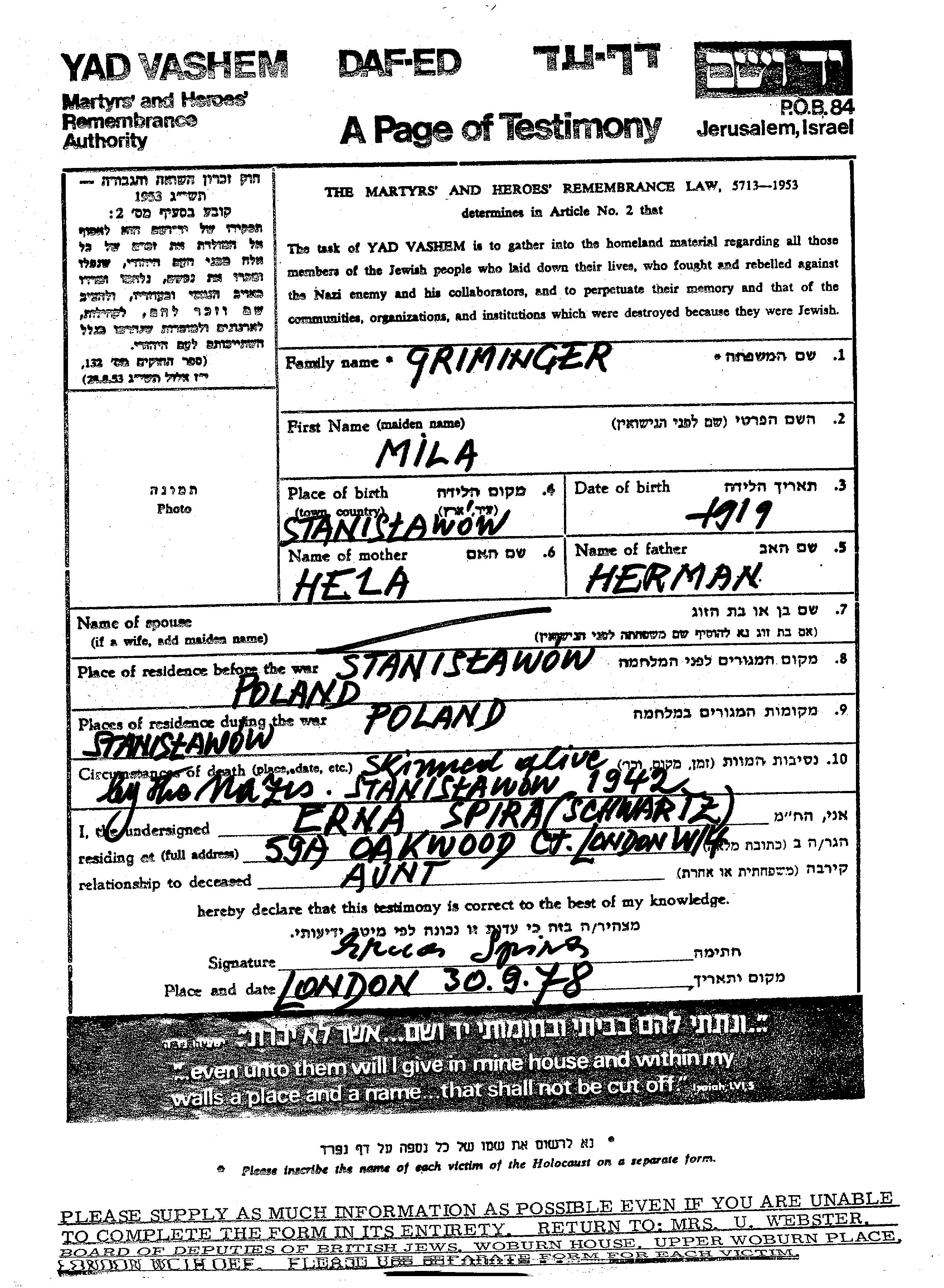 Mila Griminger wurde im Jahr 1919 in Stanislawow, Polen geboren. Sie war die Tochter von Herman und Hela. Vor dem Zweiten Weltkrieg lebte sie in Stanislawow, Polen. Während des Krieges war sie in Stanislawow, Polen.