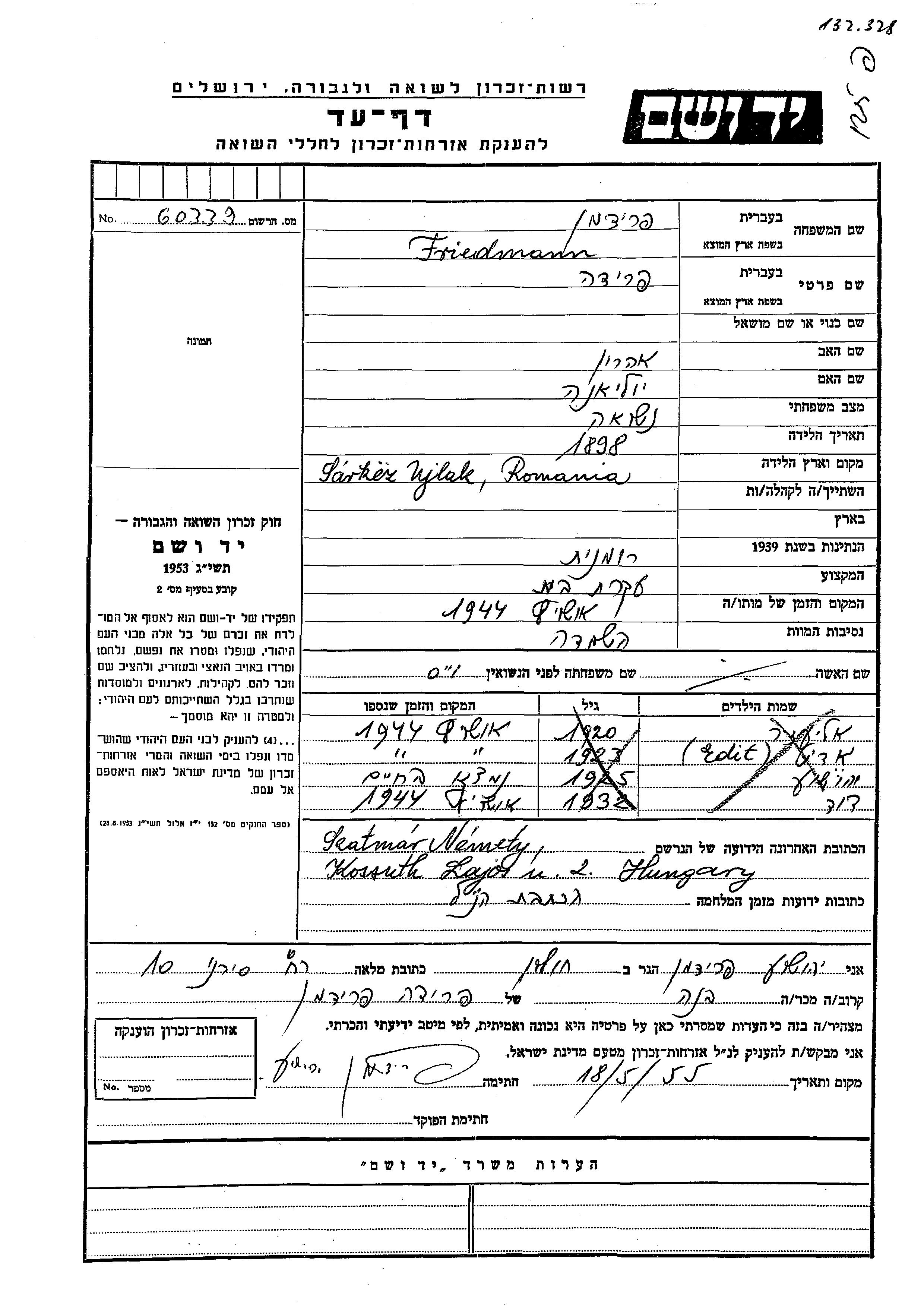 Edit Friedman wurde im Jahr 1923 geboren. Sie war die Tochter von Frida, geb. Veis. Sie war Kind. Während des Krieges war sie in Kossuth, Tschechoslowakei.