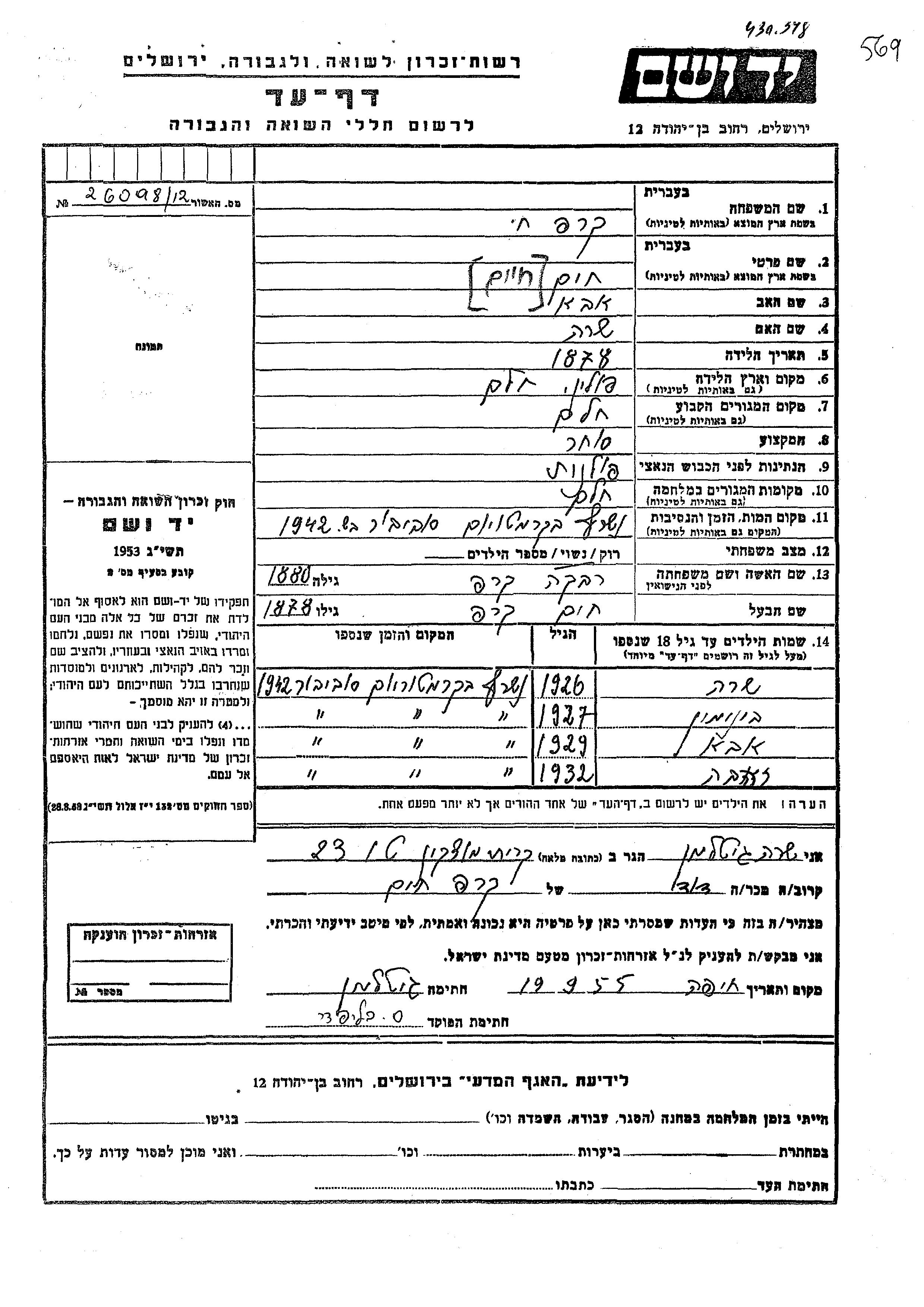 Biniamin Karp wurde im Jahr 1927 geboren. Er war der Sohn von Khaim und Rivka. Er war Kind. Vor dem Zweiten Weltkrieg lebte er in Chelem, Polen. Während des Krieges war er in Chelem, Polen.